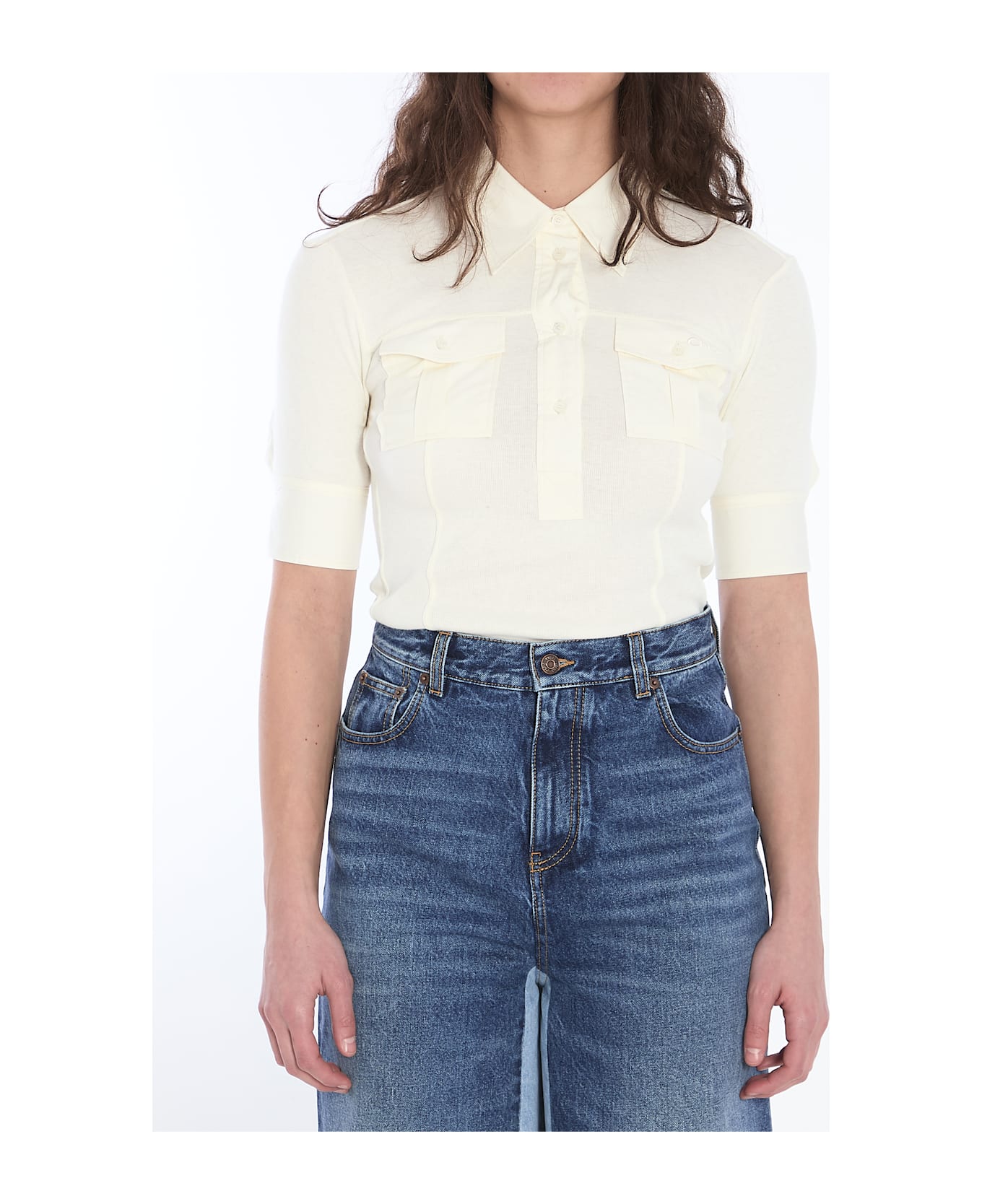 Cream ribbed cotton utility-style short-sleeve polo shirt. It features a classic collar, a four-button placket, two chest pockets with flaps and buttons and cuffs with buttons in cotton shirt-style, a tone-on-tone embroidered Chloé logo on one pocket, and raised stitching on the front. Fitted fit.