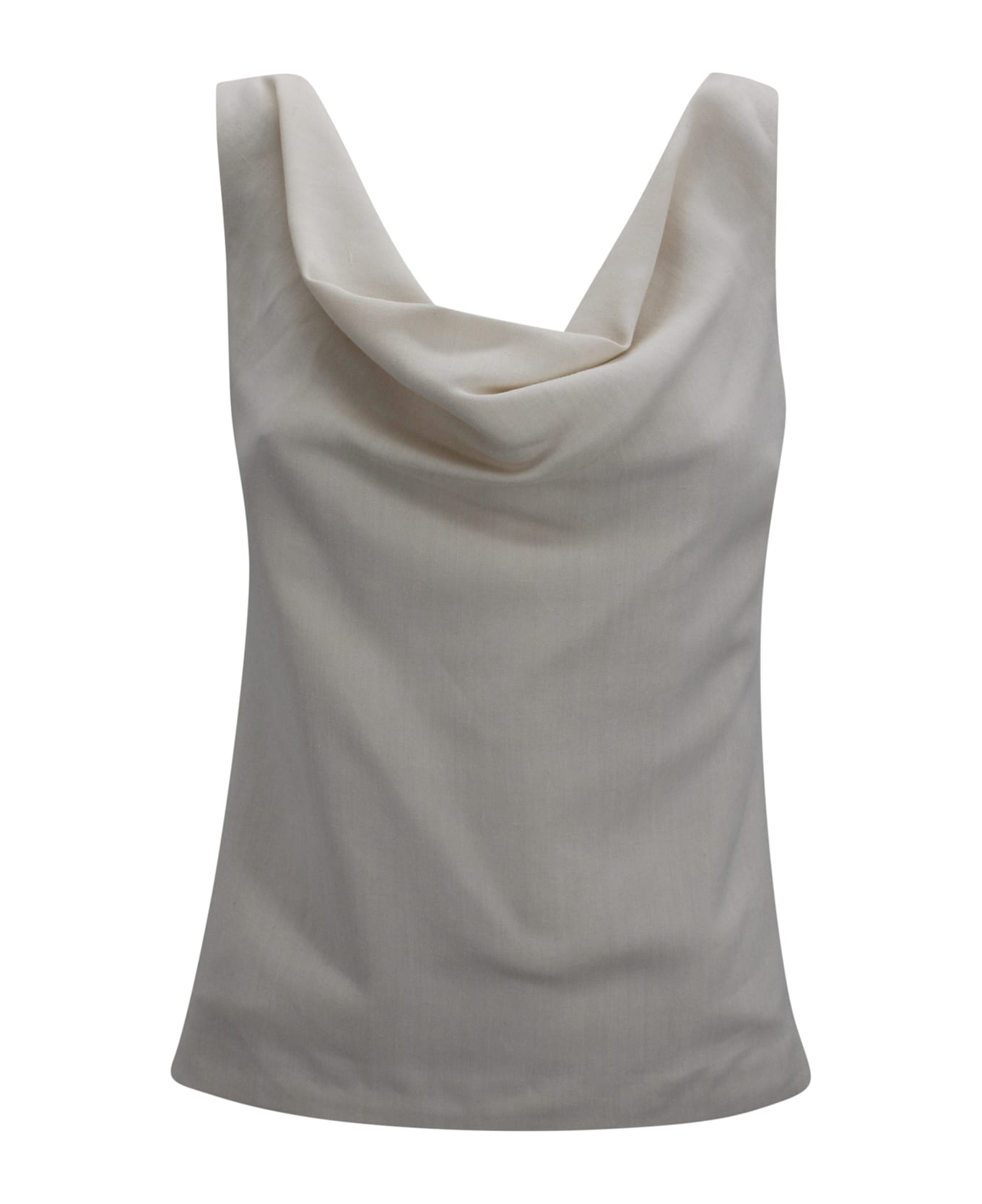 Tank top crafted in ivory fabric, featuring a draped neckline that adds softness and fluidity to the design. The sleeveless silhouette makes it a versatile piece, perfect worn alone or layered for refined outfits.