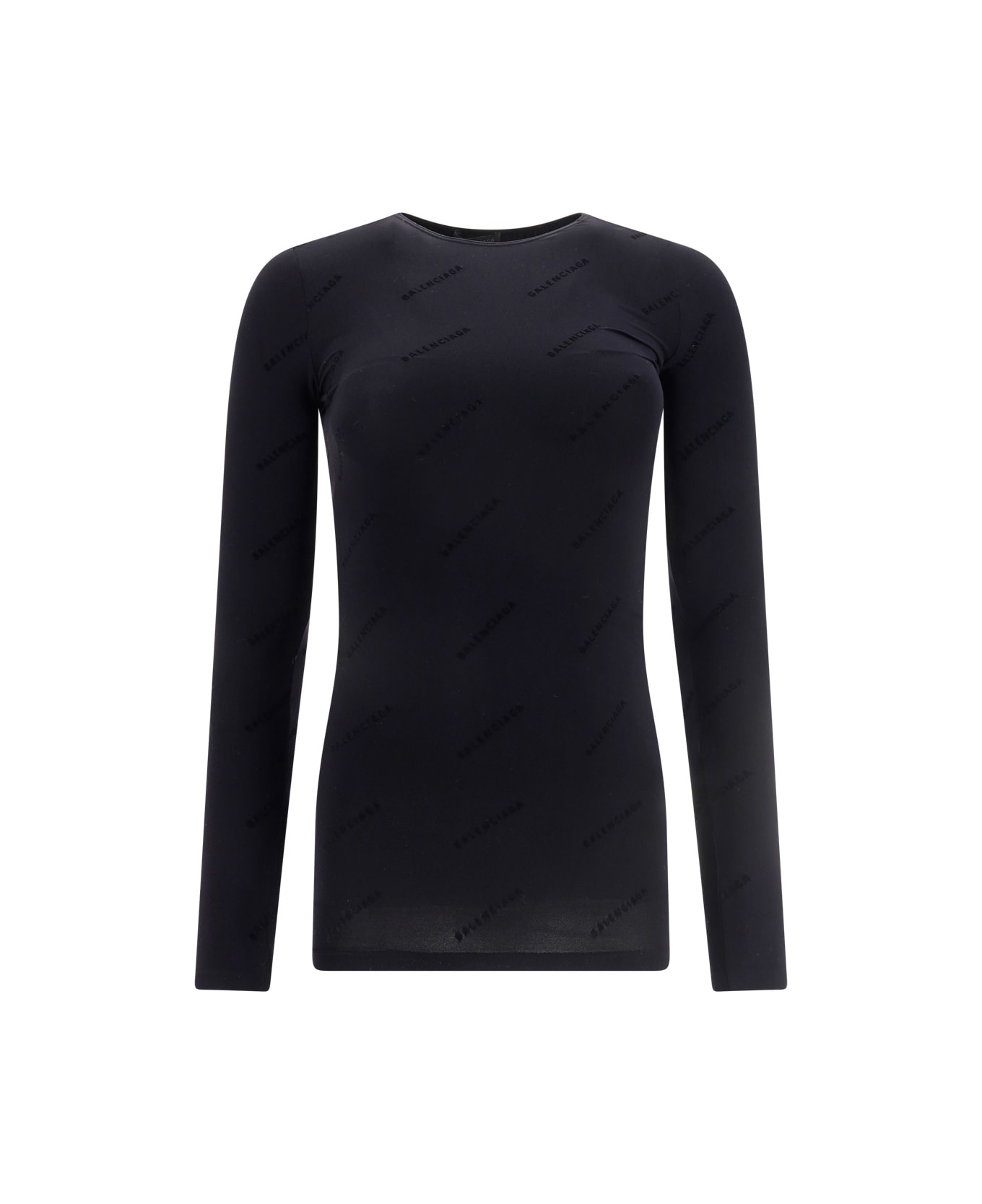 Flock top by balenciaga, crew neck, long sleeves, iconic signature brand tone on tone repeated all-over, ultra slim fit, stretch design.