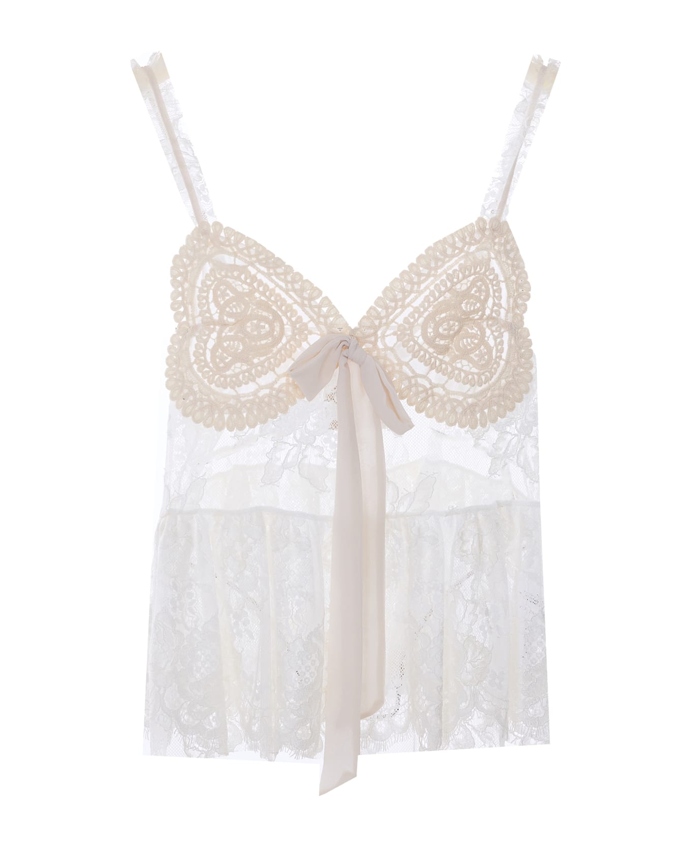 Aniye By white lace Noa top, adjustable shoulder strap, embroidered bra detail, bow detail on the front Composition: 40% Polyamide, 26% Modal, 25% Viscose, 9% Cotton, 100% Polyester