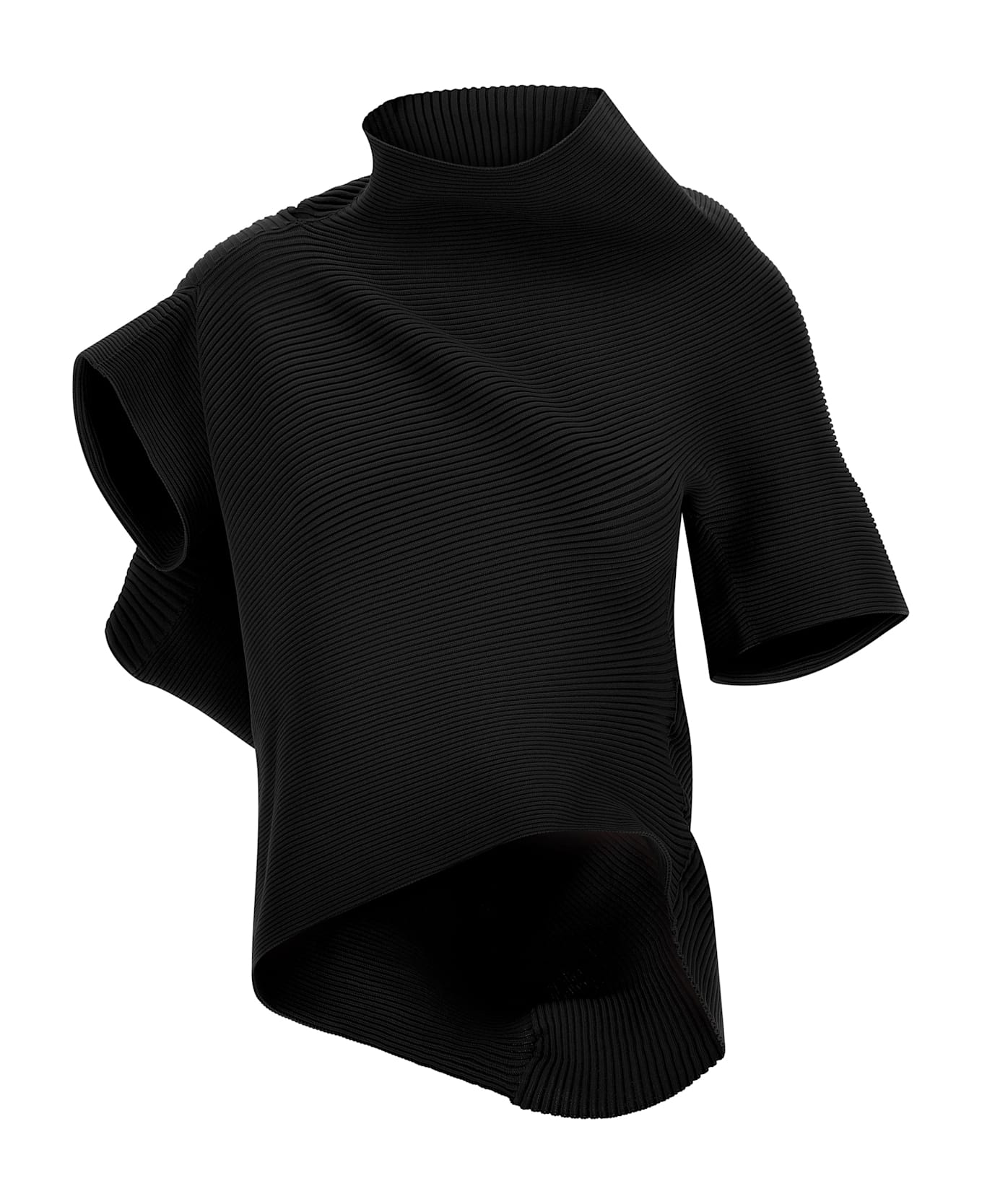 'Life form' stretch knit top with ribbed pattern, tubular shapes, asymmetric, wide high neck and beveled short sleeves.