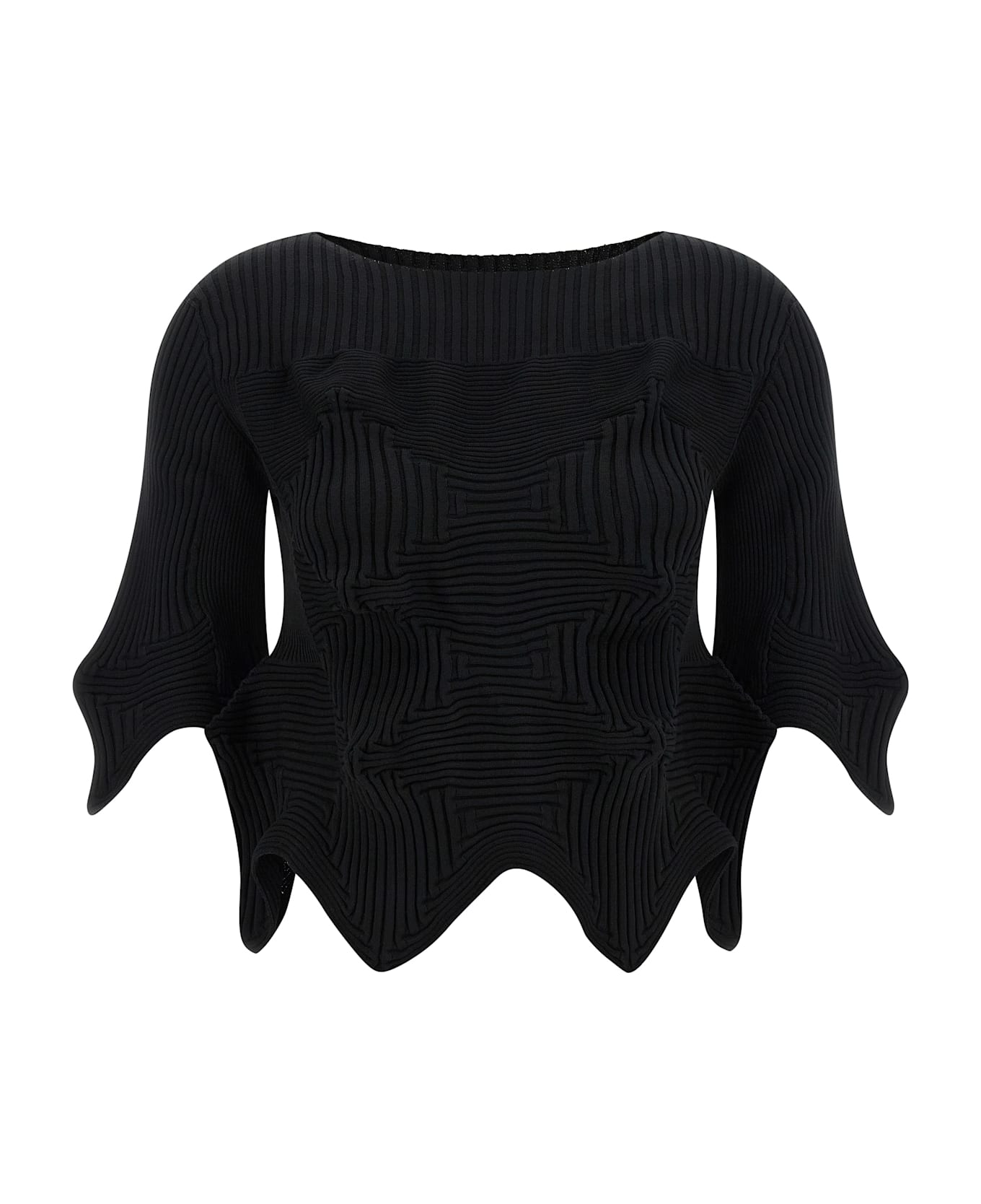 'Linkage' crewneck knit cropped top with elastic ribbed weave structure with asymmetric hem and short sleeves.