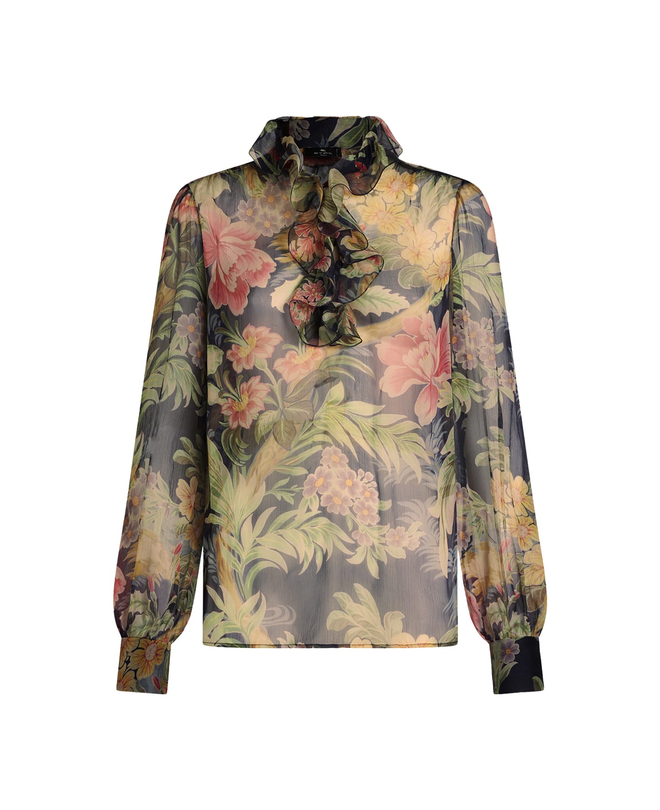 Etro blouse made from lightweight silk creponne and decorated with a multicoloured floral print. The design features a ruffled V-neck, long sleeves, and covered button cuffs. Regular fit.