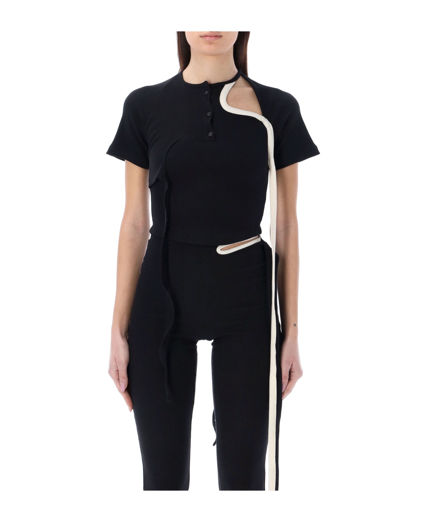 Stretch Cotton Otto Lounge Rib T-shirt By Ottolinger. Featuring: Crewneck Three-buttons Placket Short Sleeves Cut-out At Left Shoulder With White Tie Additional Panel At Right With Long Strap Detail Curved Hem Model Is 1,72 M Tall And She Is Wearing Size Xs
