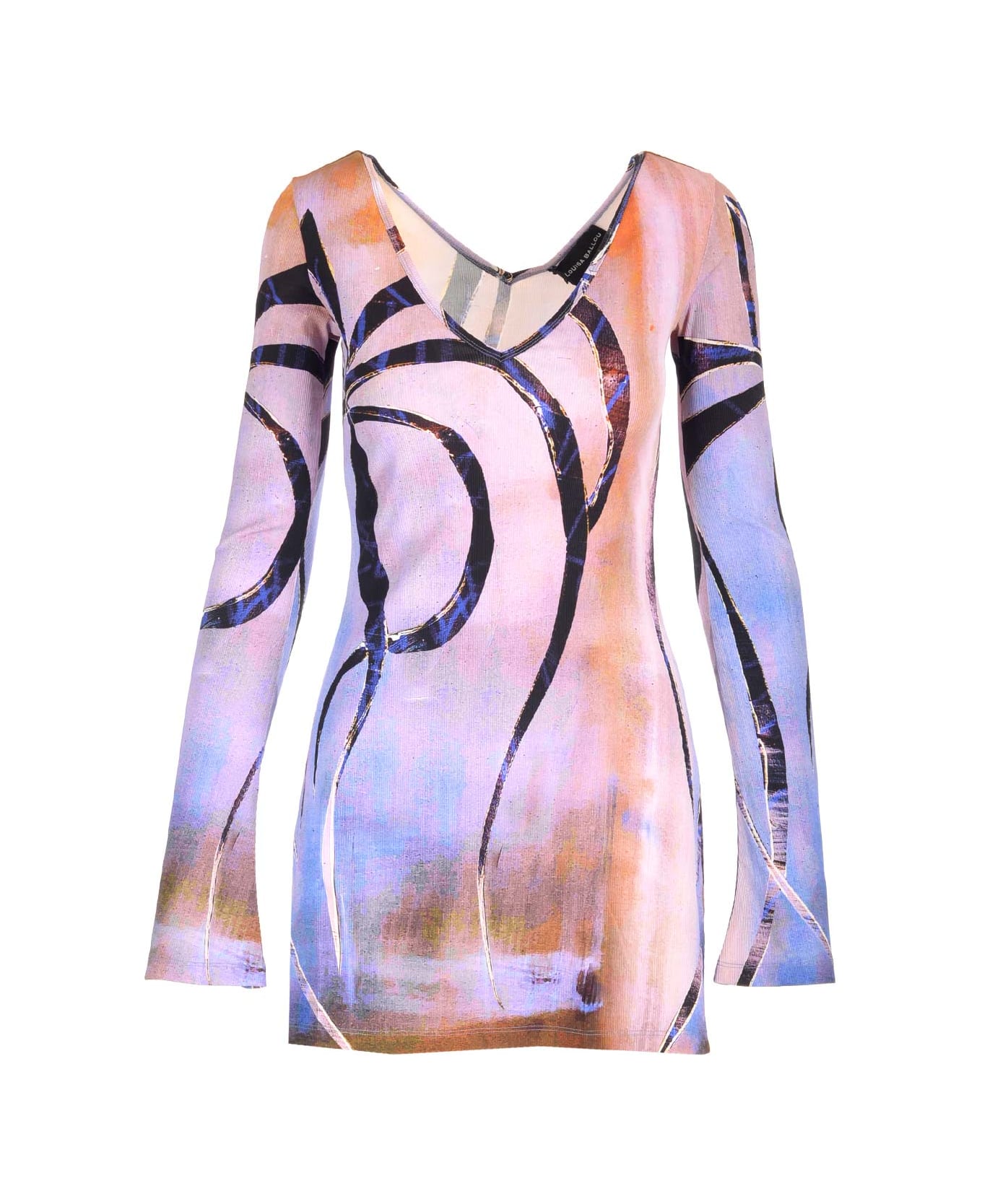 Patterned "Enigma" ribbed mini dress from Louisa Ballou in stretch cotton, long bell sleeves, V-neck.