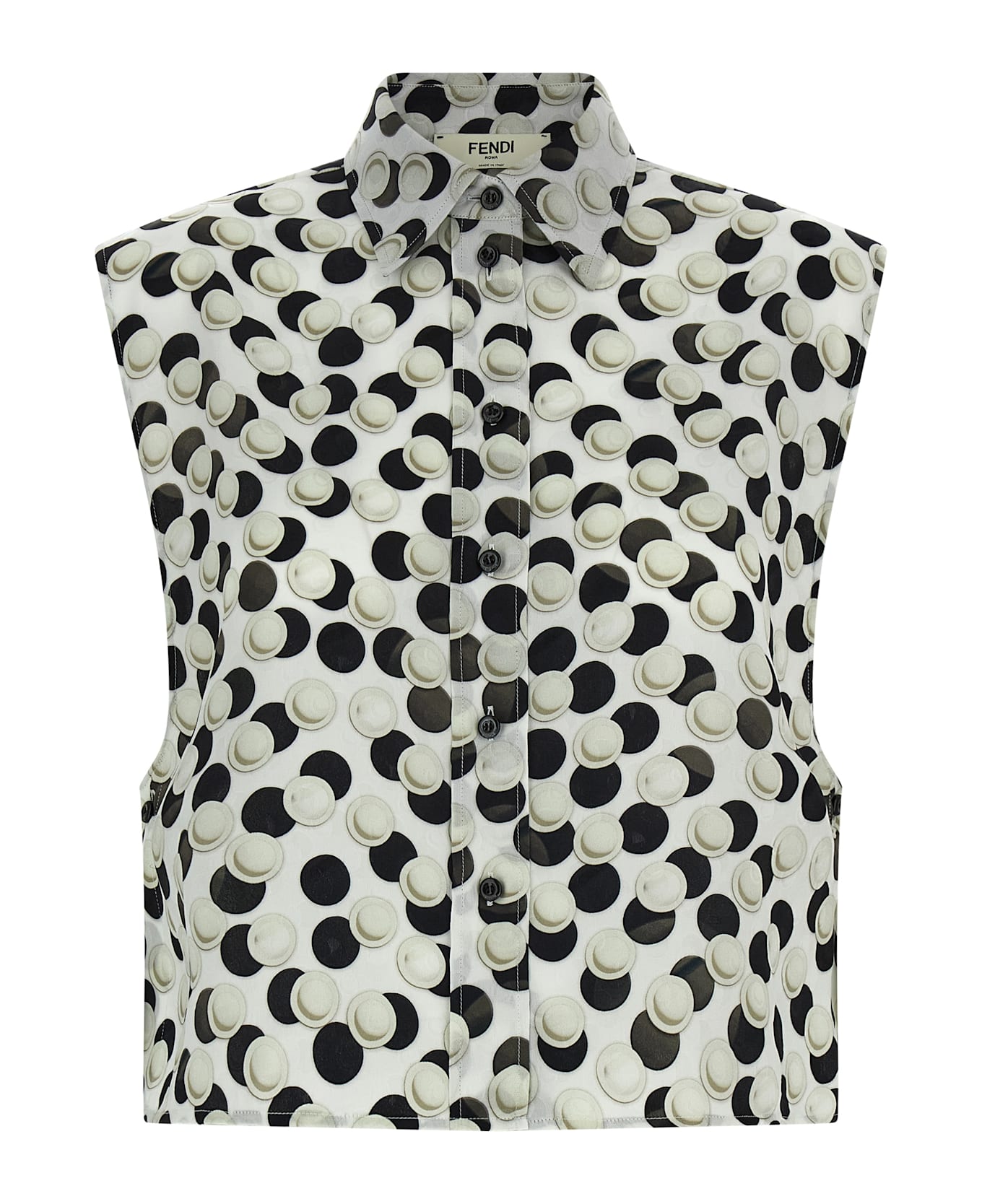 Jacquard polka dot patterned silk top, crop model, shirt collar, front button closure, side slits with button. Composition: 100% silk