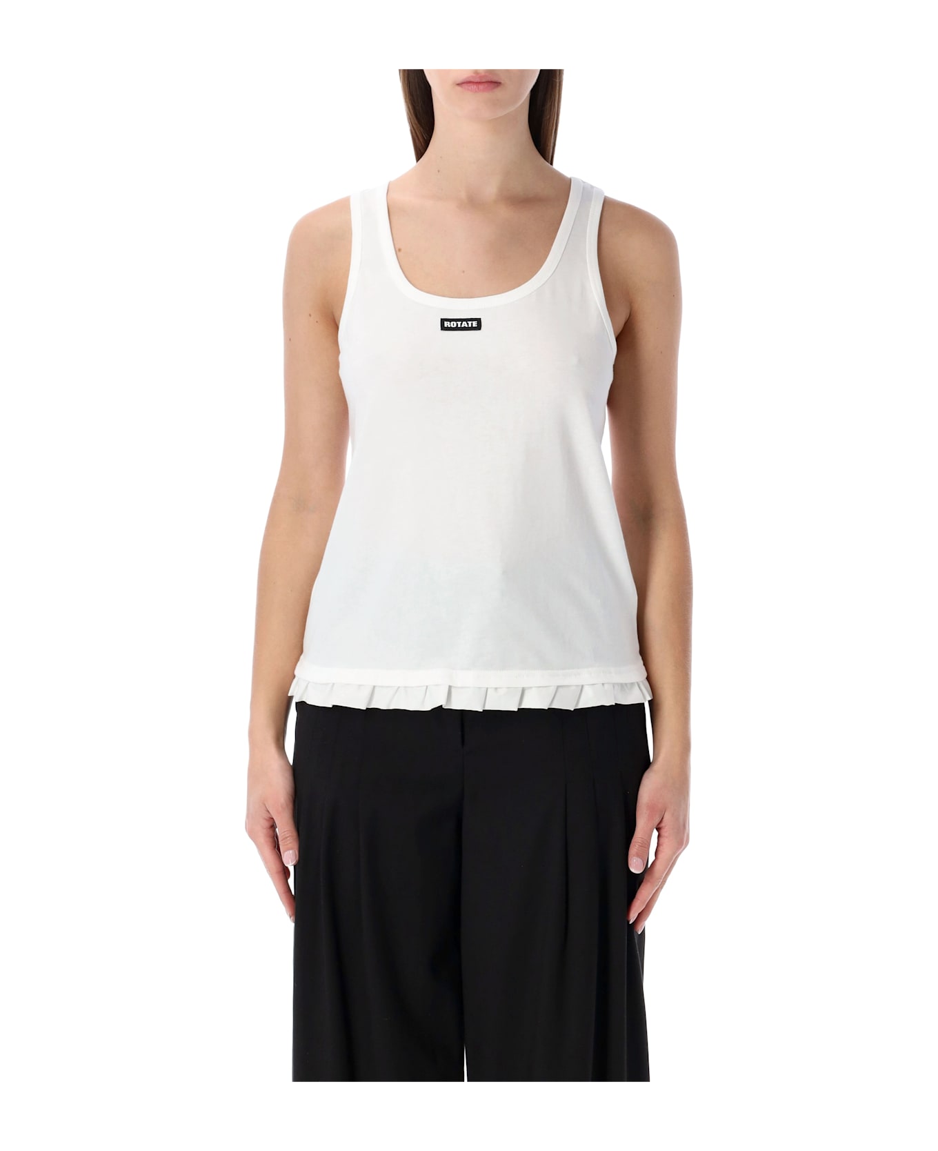 The Rotate cotton tank top Combines Simplicity And Charm With A Soft Silhouette Enhanced By A Ruffled Hemline. Finished With The Signature Logo On The Chest, It s An Easy-to-wear Staple For Relaxed Yet Polished Everyday Looks. Round neckline Front logo label Ruffled hem detail Wide shoulder straps Regular fit Alessandra Is 1,75 M And Wears Size S