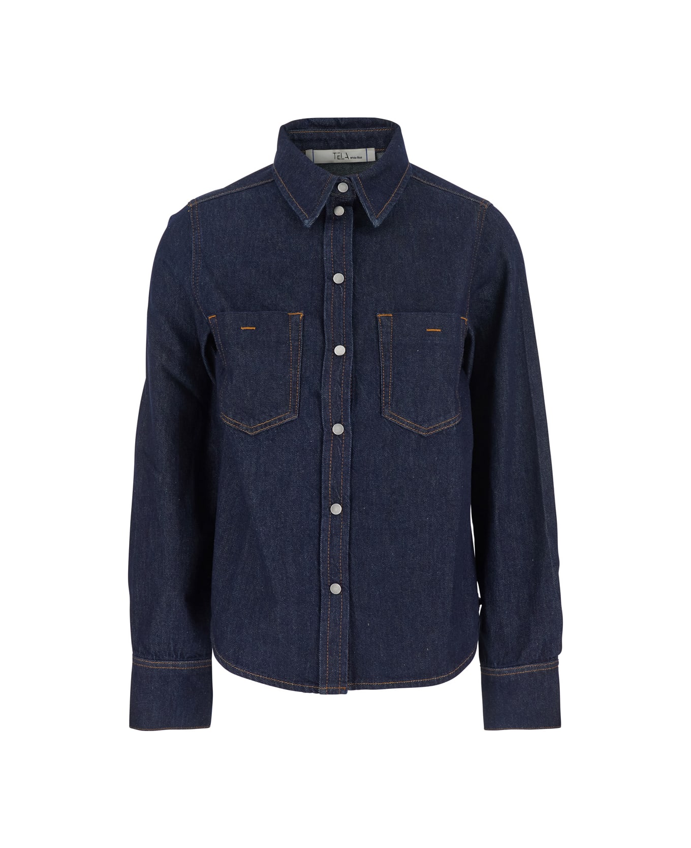 Shirt Blue Pointed collar Long sleeves Front button closure Two front patch pockets Buttoned cuffs Denim Regular fit