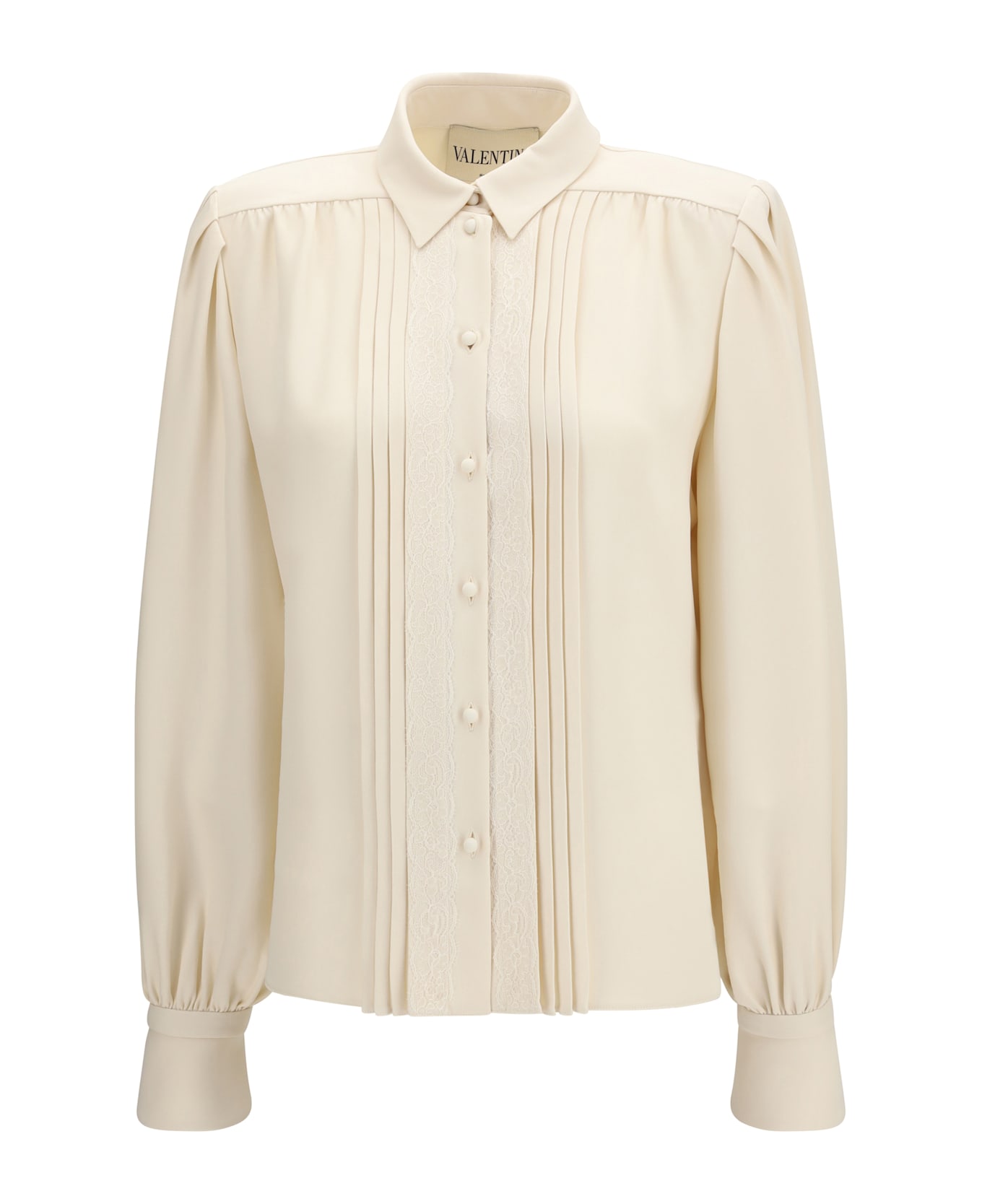 The cady couture shirt by valentino is an elegant piece with a tailored construction. crafted from cady couture, it features pleated detailing on the front that adds movement and depth to the surface. padded shoulders structure the silhouette, creating a sharp and sophisticated line, while the front closure with silk buttons completes the piece with a refined detail consistent with the maison s couture aesthetic.