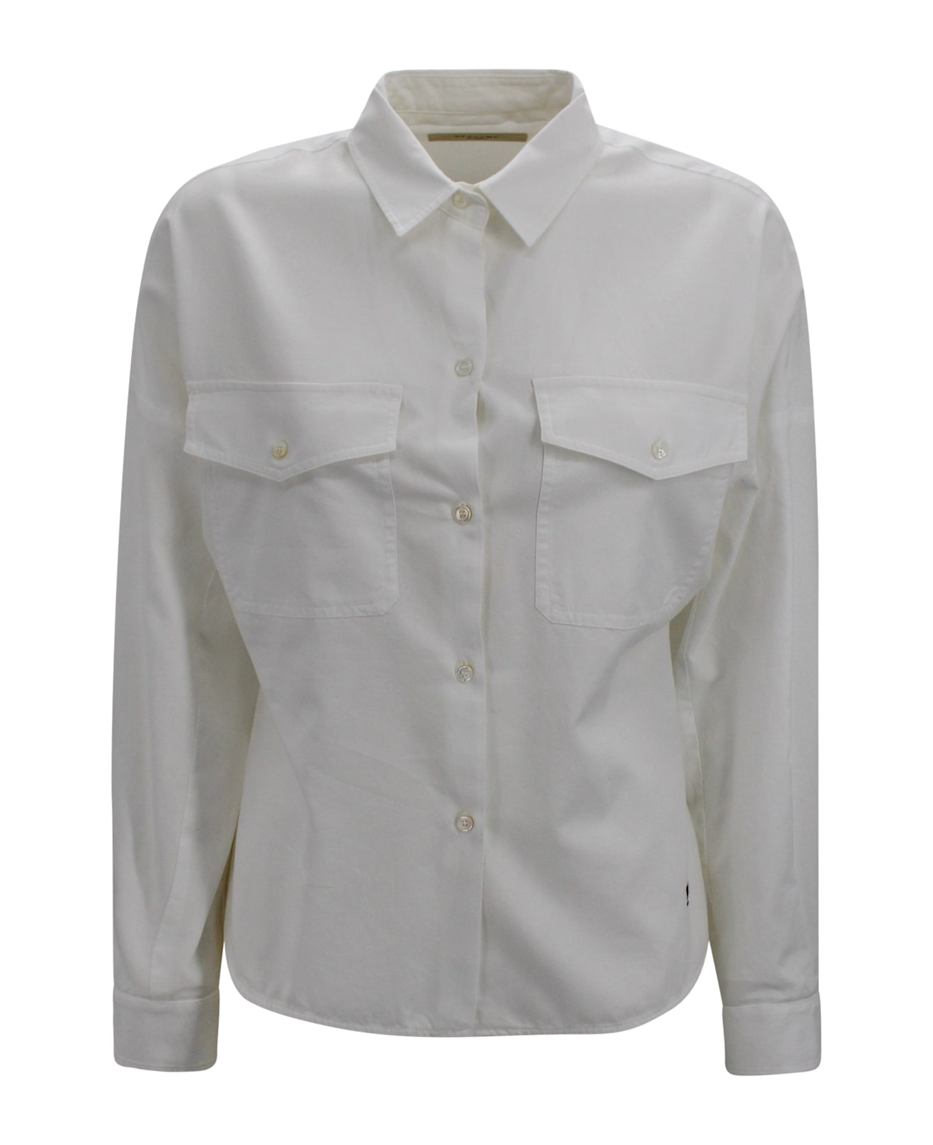Classic shirt crafted from striped pure cotton poplin, made with organically grown cotton. The design features a straight cut with rounded hem, classic collar and cuffs, visible front button fastening, and a chest patch pocket. Finished with a small embroidered butterfly logo on the front hem, worn on the left side, and a back yoke with central pleat.