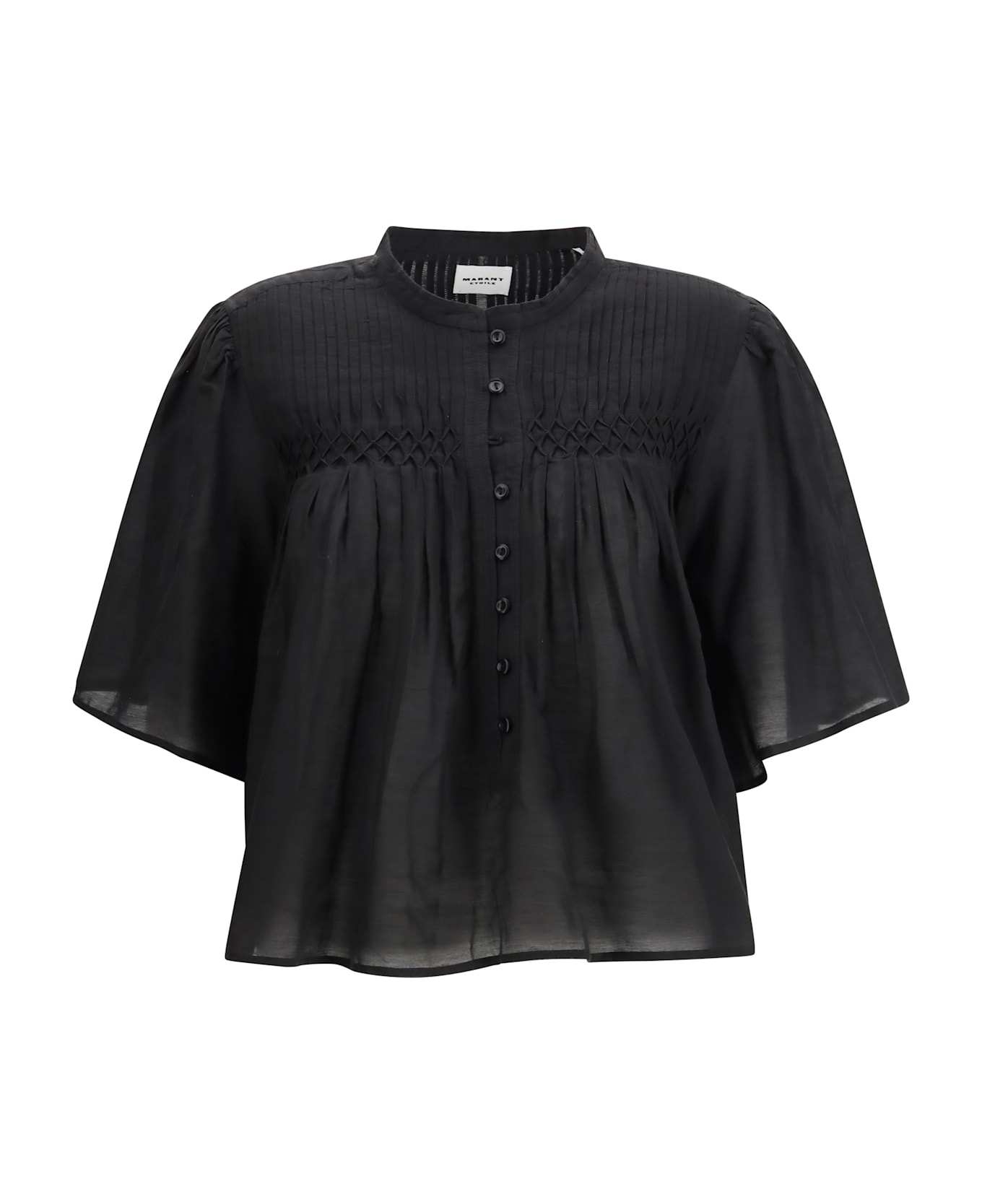 The cotton shirt by marant Étoile embodies a romantic and airy style, defined by its pleated design that adds movement and femininity. the round neckline and dropped shoulders create a soft, relaxed silhouette, while the short sleeves complete the look with effortless ease. the front button closure and straight hem finish the piece, making it a versatile option for refined everyday outfits in a solid color.