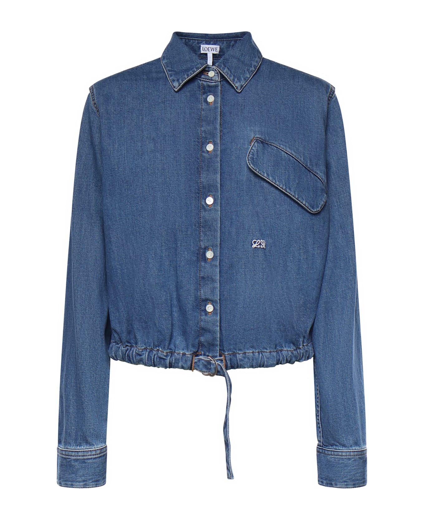- Made of cotton denim - Front button closure - Diagonal chest pocket - Adjustable belt at hem - Relaxed fit - Size shown is 34 - Made in Italy - Color: Light Blue
