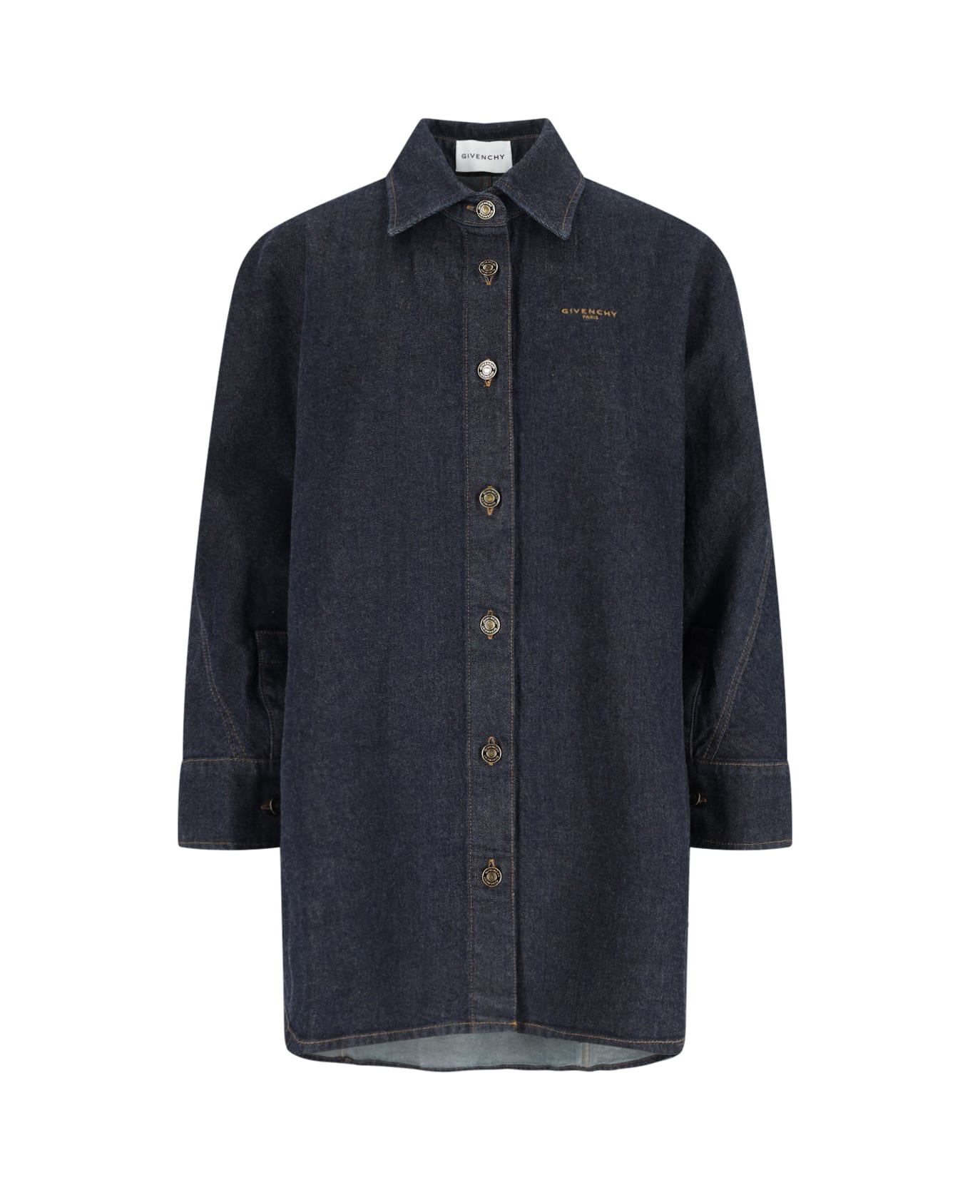 Givenchy logo denim shirt in blue with classic collar, button closure, logo embroidery on the chest, logo patch on the back, and straight hem. Composition: 100% Cotton
