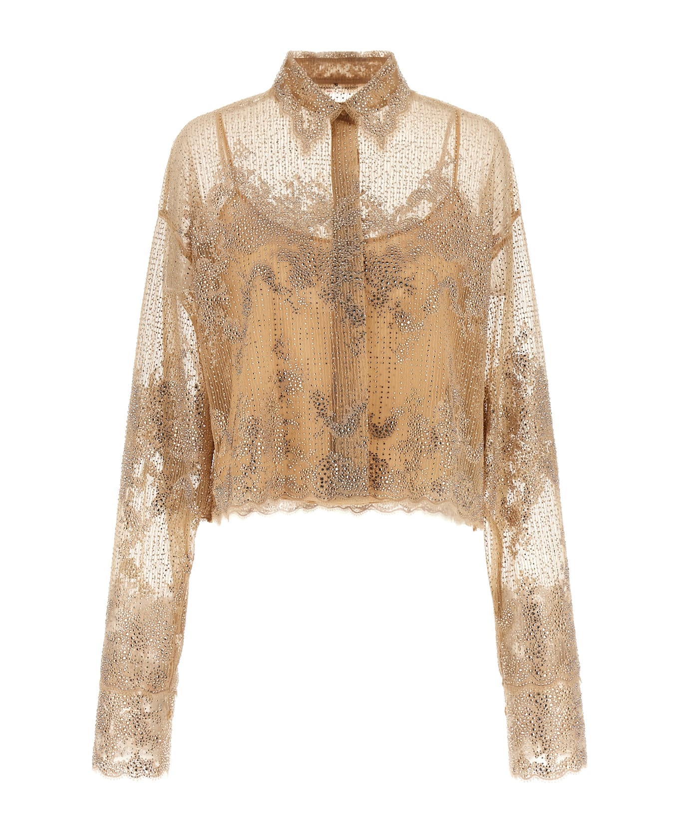 Semi-transparent tulle shirt with all-over crystal application and embroidery detail, tone-on-tone silk chiffon petticoat, detachable with thin straps, classic collar, front closure with hidden buttons, slightly cropped style with lace hem, long sleeves with cuffs.
