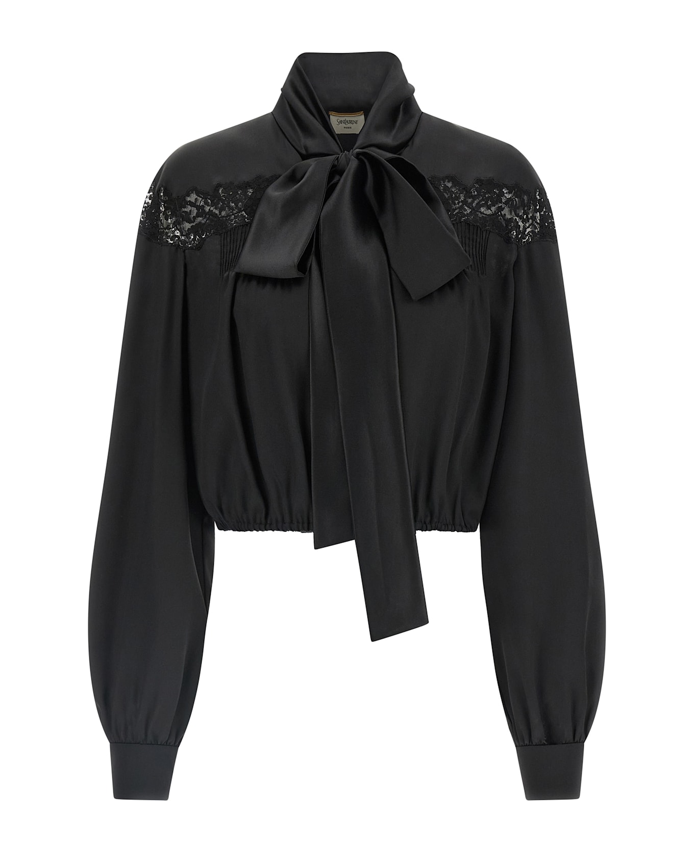 Silk shirt with tone-on-tone lace inserts, crop model, lavallière collar, button closure and clamp to create front curls, long sleeves with cuffs, elastic on the hem. Composition: 100% silk