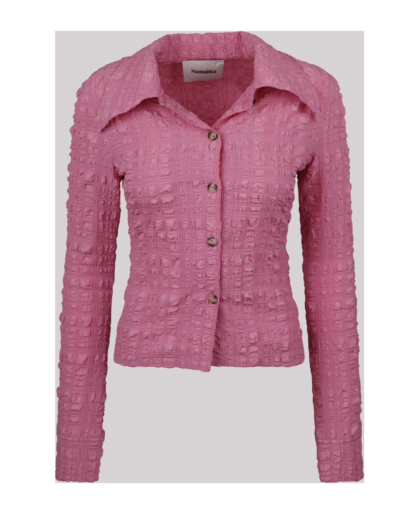 Fitted long-sleeve seersucker shirt from NANUSHKASeersucker texture. Check pattern. Straight-point collar. Long sleeves. Buttoned cuffs. Front button fastening. Slim cut. 64% Polyester, 32% Polyamide, 4% Elestane. Made in Hungary.