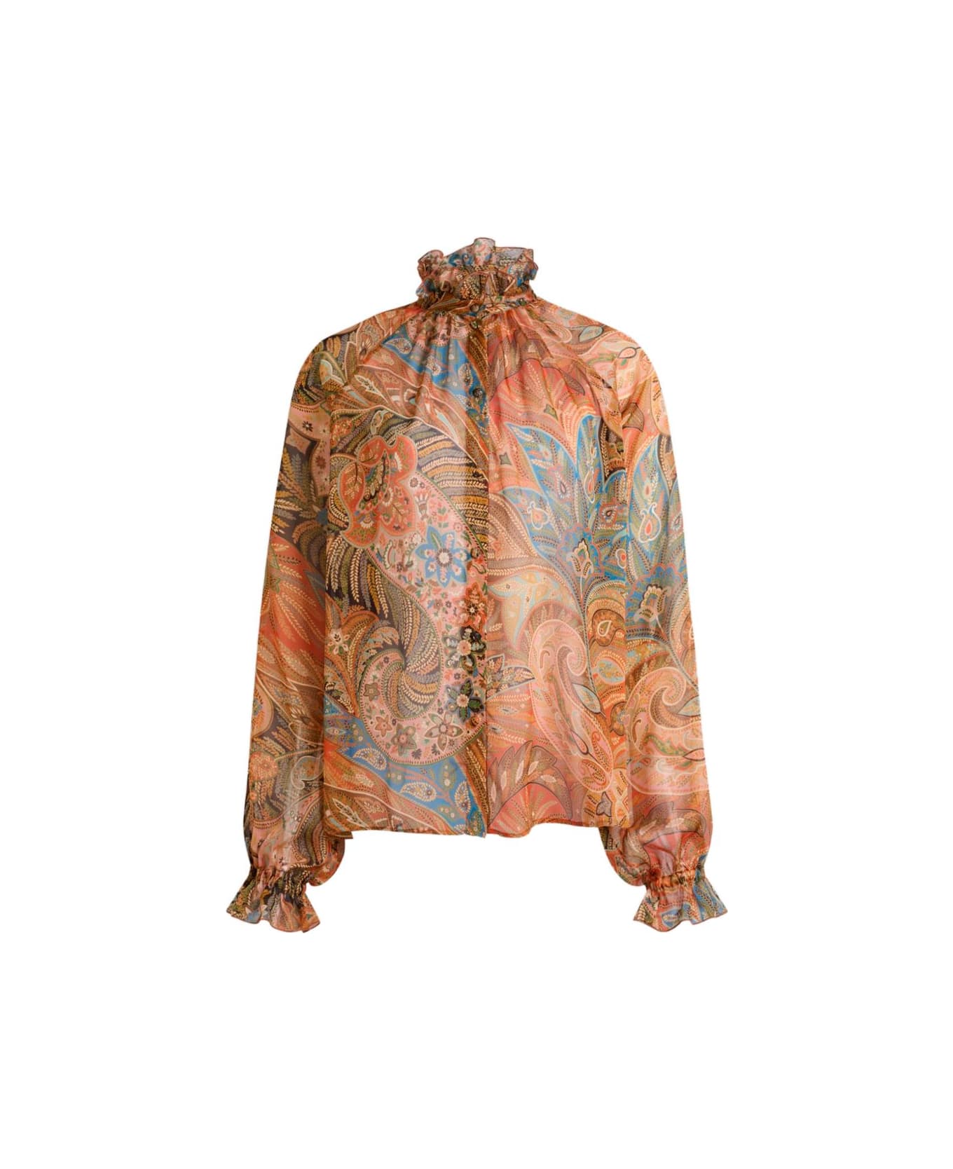 orange and multicolour paisley motif ruffles button fastening long sleeves gathered cuffs