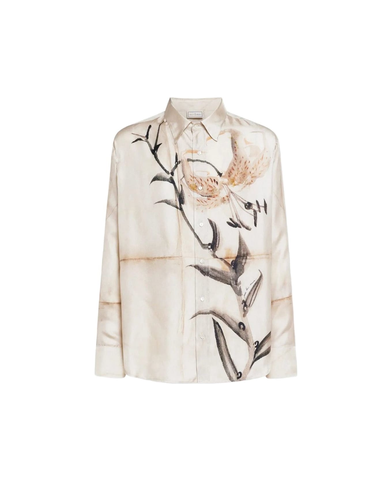 beige, botanical print, silk, long sleeves, button fastening