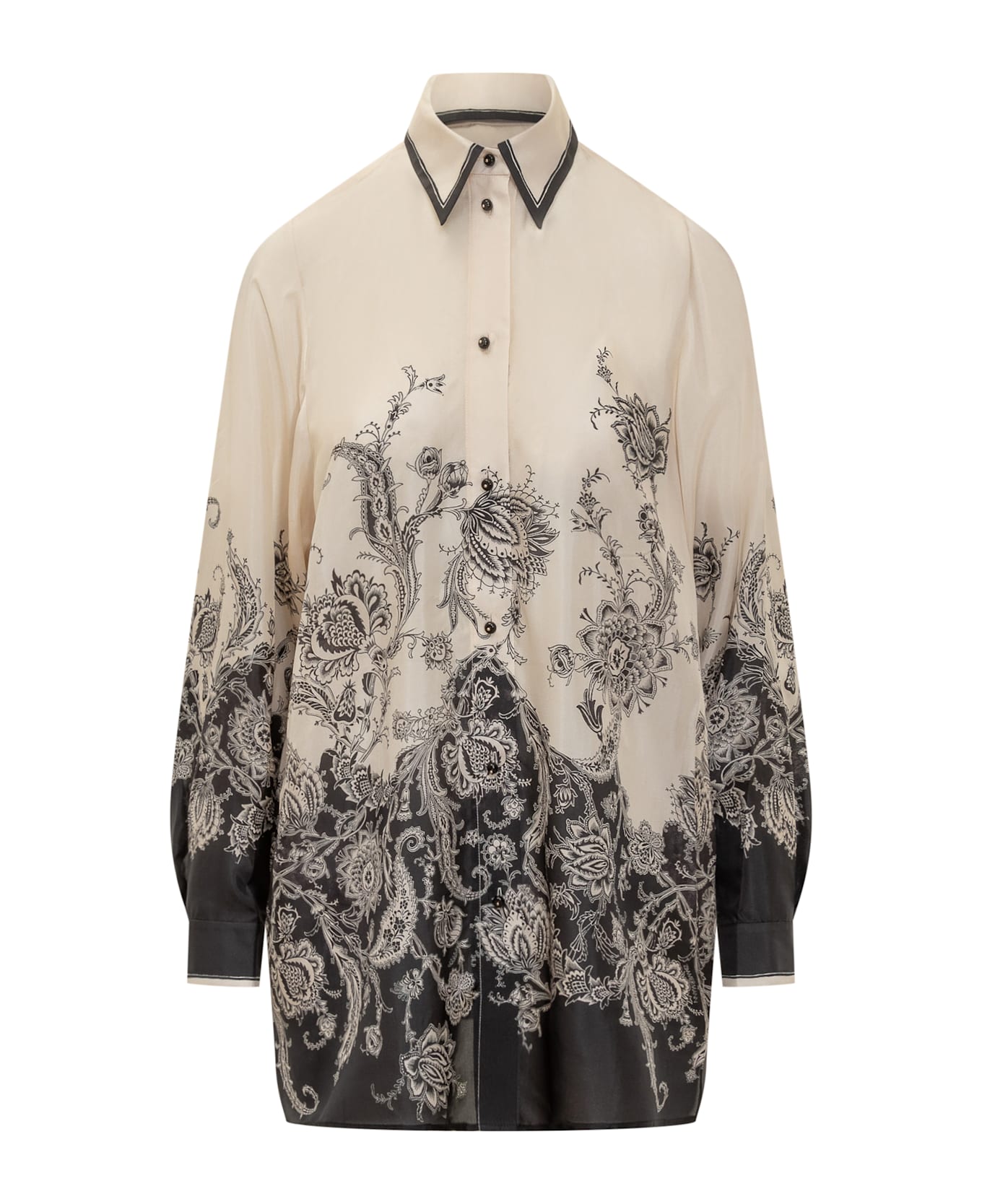 Pointed collar. Closure with buttons. Cuffs with button.