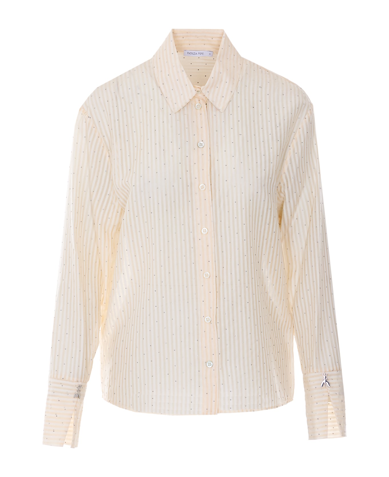 Patrizia Pepe shiny ivory shirt with frontal buttons closure, regular collar, long sleeves, all over strass details, plaque logo detail