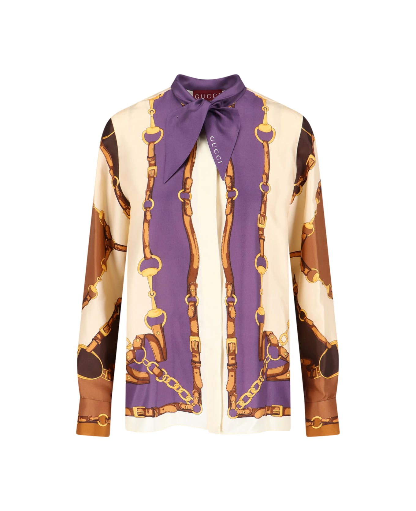 Gucci silk twill shirt, multicolor, front bow neckline, long sleeves, all-over printed details, cuff buttons, straight hem. Composition: 100% Silk