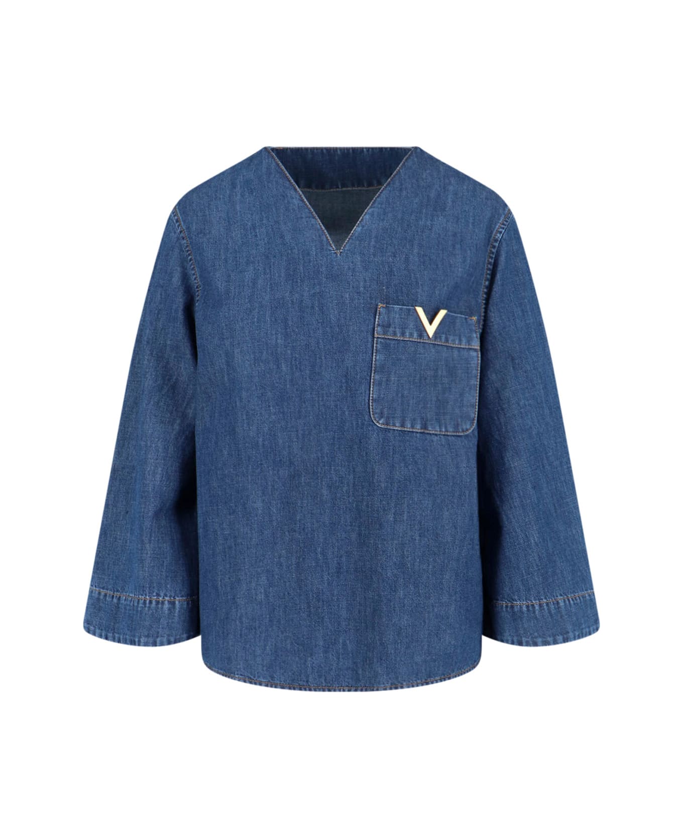 Valentino "VGold" blue cotton chambray top with V-neck, long sleeves, front pocket, gold metal "V" logo on the front, curved hem. Composition: 100% Cotton