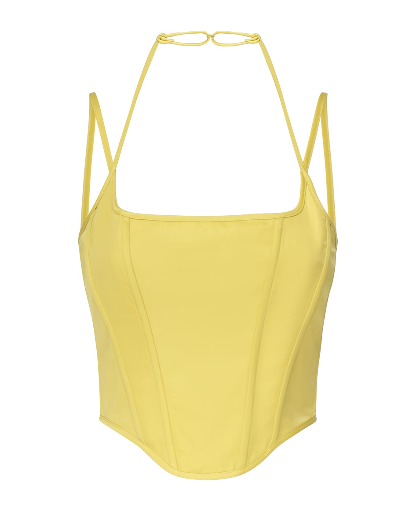 -Made of duchesse -Thin shoulder straps -Adjustable drawstring that ties at the back of the neck -Zip closure in the center back -The size shown in the photo is 40 IT -Color: Yellow