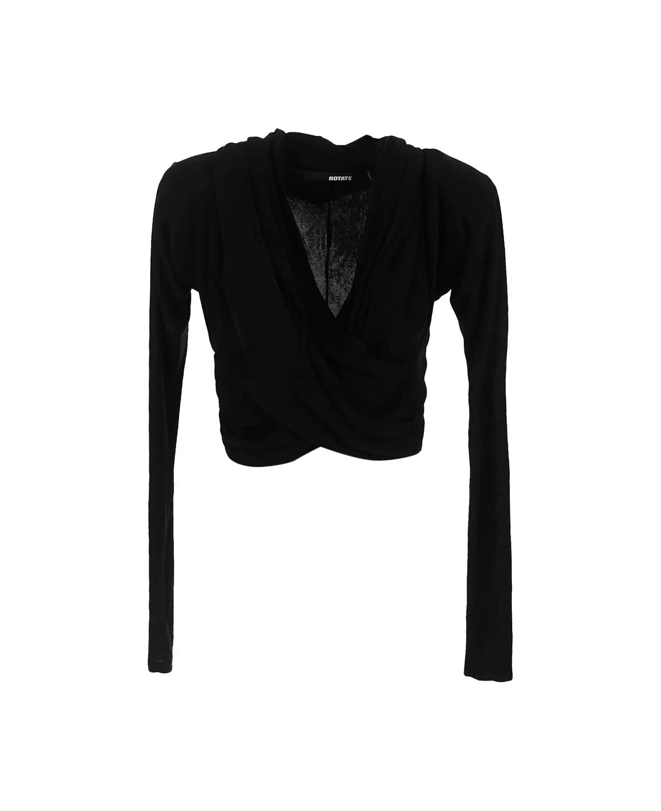 Rotate top in black recycled polyester with cropped length, long sleeves, tight fit, asymmetric gathered details, padded shoulders, a V-neckline and cowl neck.
