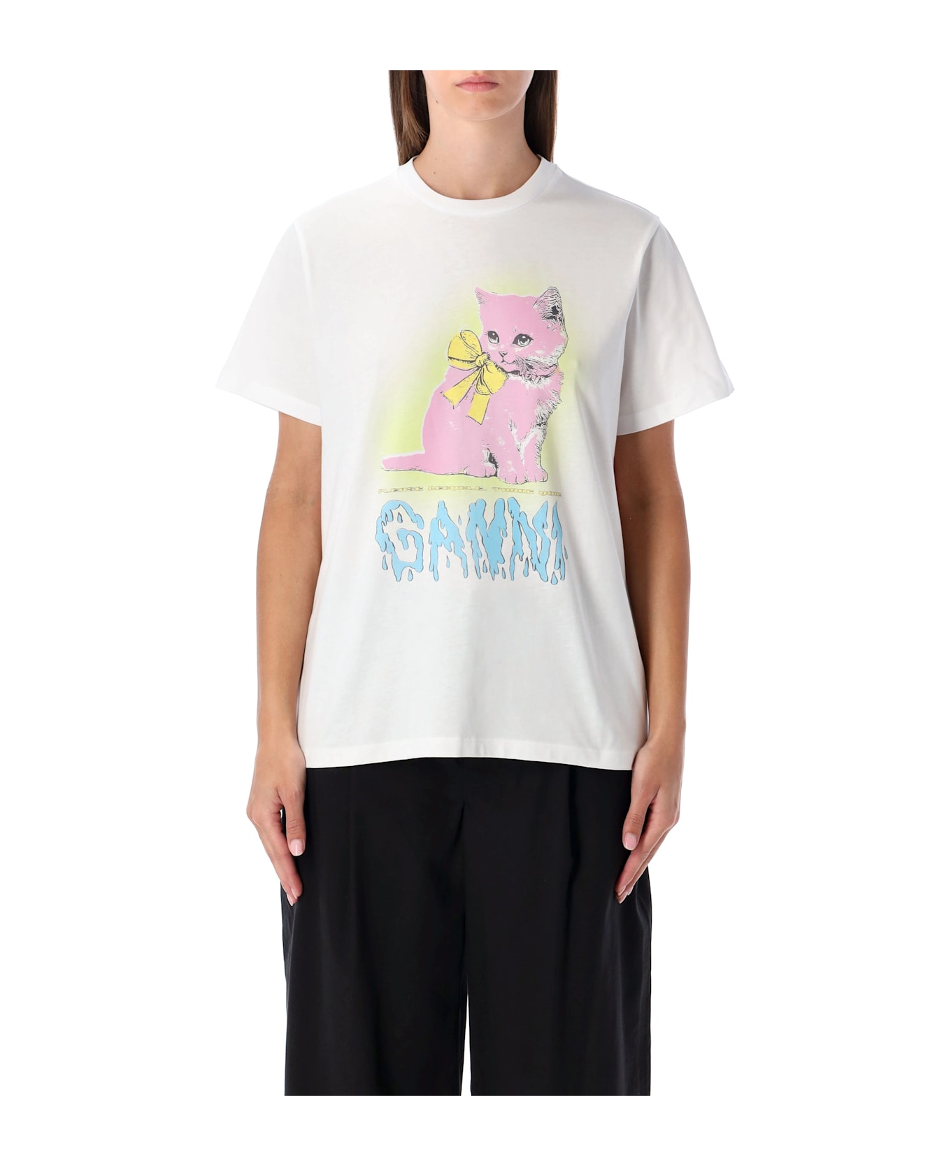 Made From Soft Organic Cotton, The Ganni Kitty T-shirt Brings Playful Energy To Everyday Dressing. Designed With A Round Neckline, Short Sleeves And A Relaxed Fit, It Features A Graphic Print On The Front And The Signature Ganni Logo. A Versatile Wardrobe Staple That Combines Comfort With Contemporary Style. Round Neckline Short Sleeves Kitty Print On Front Ganni Logo Relaxed Fit Alessandra Is 1,75 M And Wears Size S