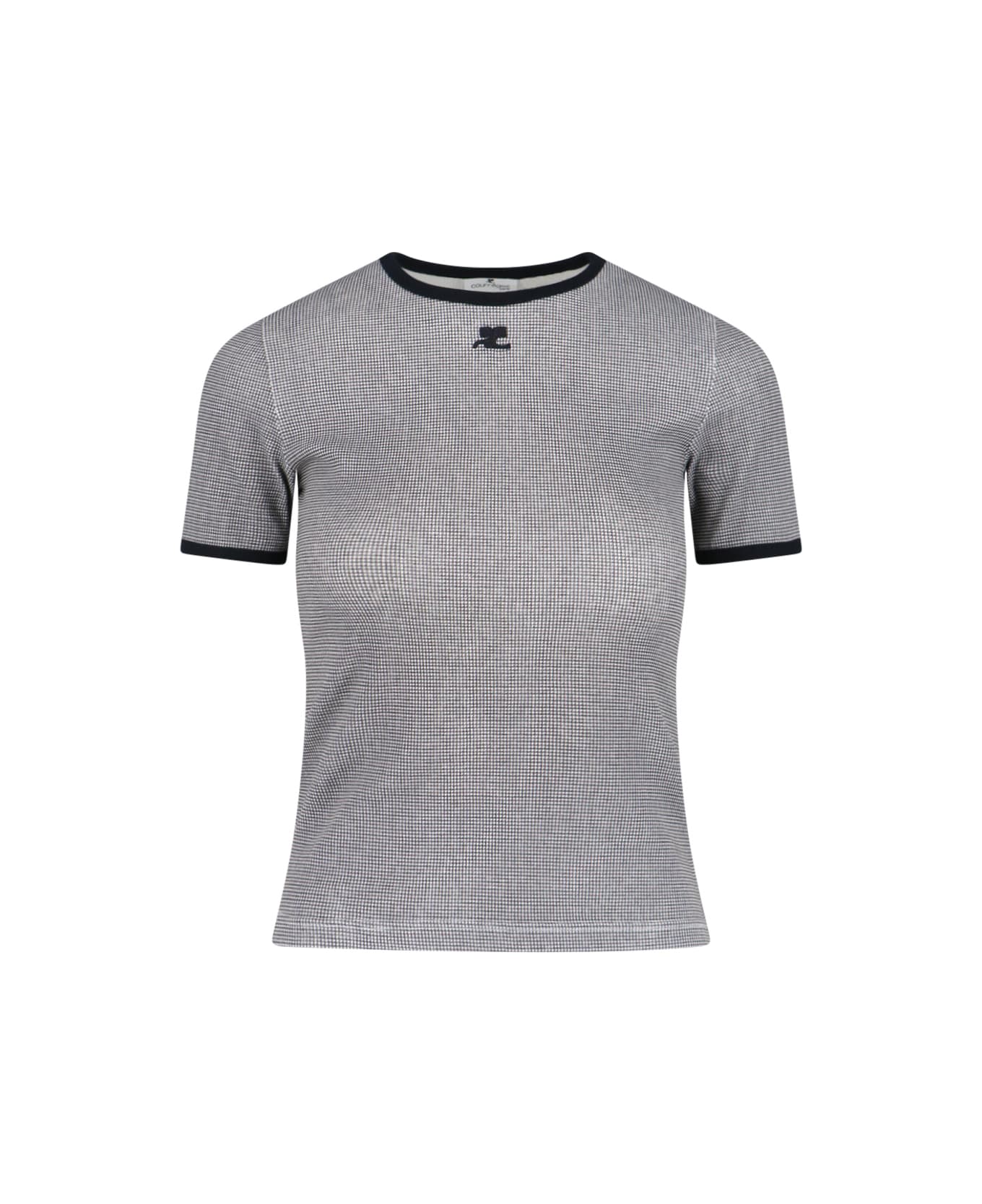Courreges logo T-shirt in black and white cotton with houndstooth pattern, crew neck, short sleeves, logo detail embroidered at the front, contrasting trim, straight hem.