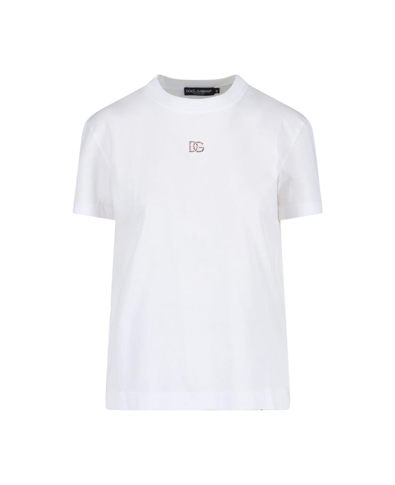 Dolce & Gabbana white cotton t-shirt with crew neck, short sleeves, rhinestone logo on the front, straight hem. Composition: 100% Cotton