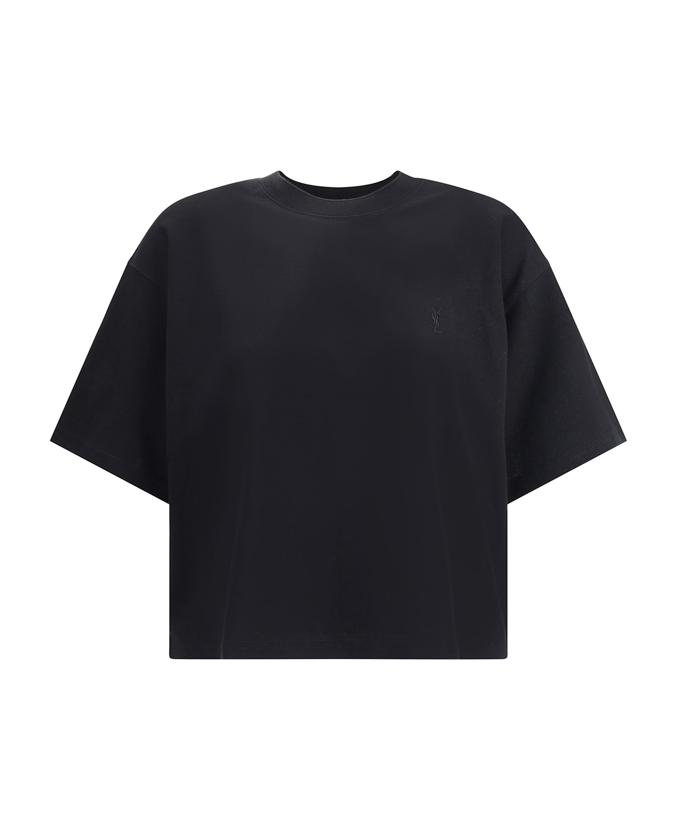 Soft cotton t-shirt by saint laurent features a ribbed crew neck and tone-on-tone embroidery of the iconic ysl logo on the front. the design features an oversized fit for a modern and comfortable look that is ideal for pairing with casual and on-trend outfits.