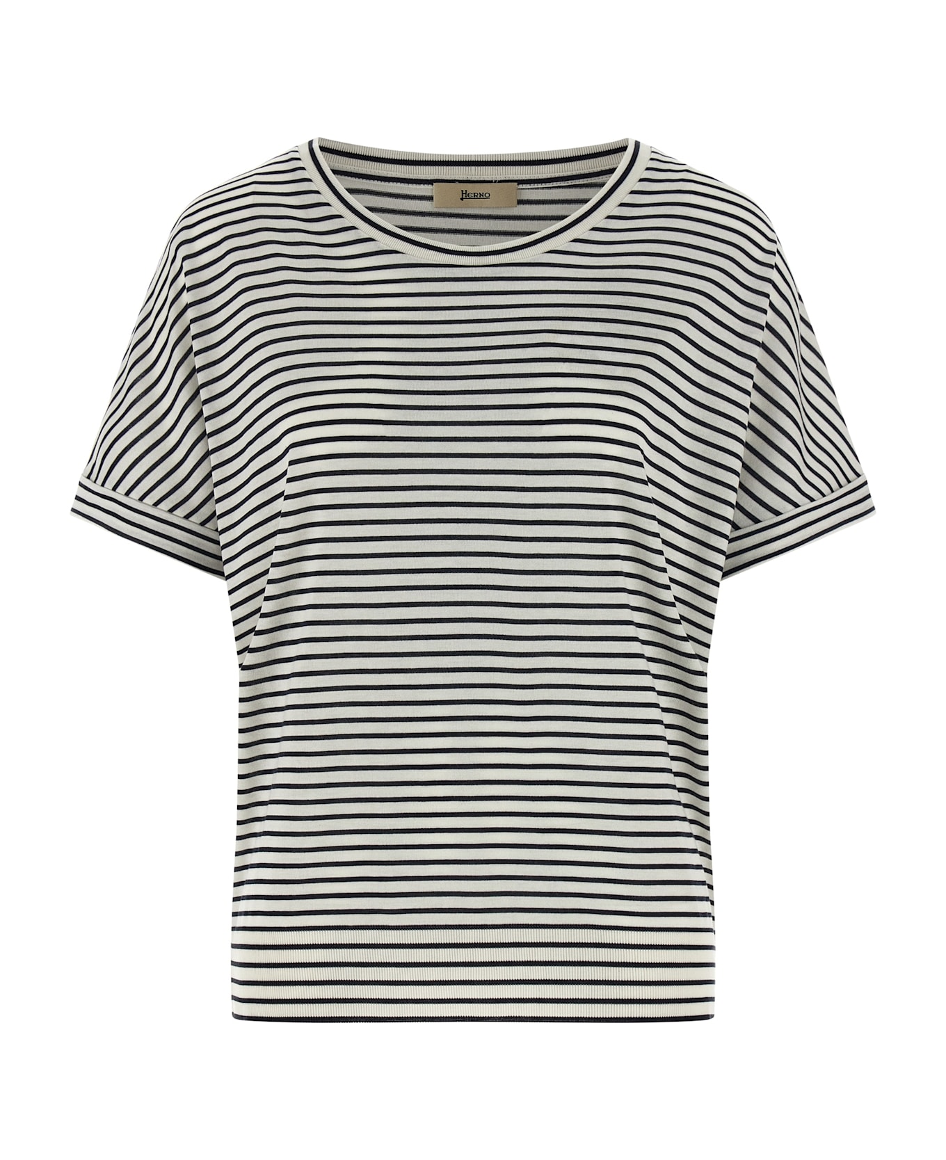 Striped lyocell and cotton blend T-shirt, with round neckline, short sleeves with turned-up cuffs, and band on the hem.