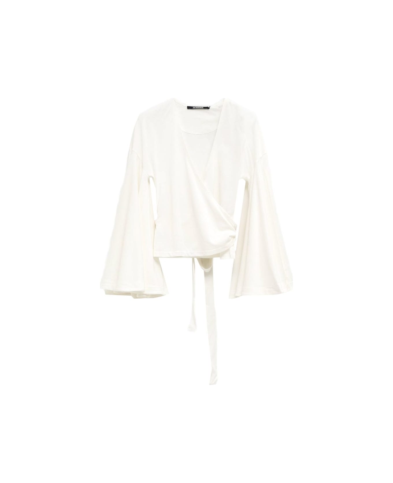 white tie fastening flared sleeves wrap style V-neck long sleeves Composition: Principal:, 57% Paper, 43% Polyester
