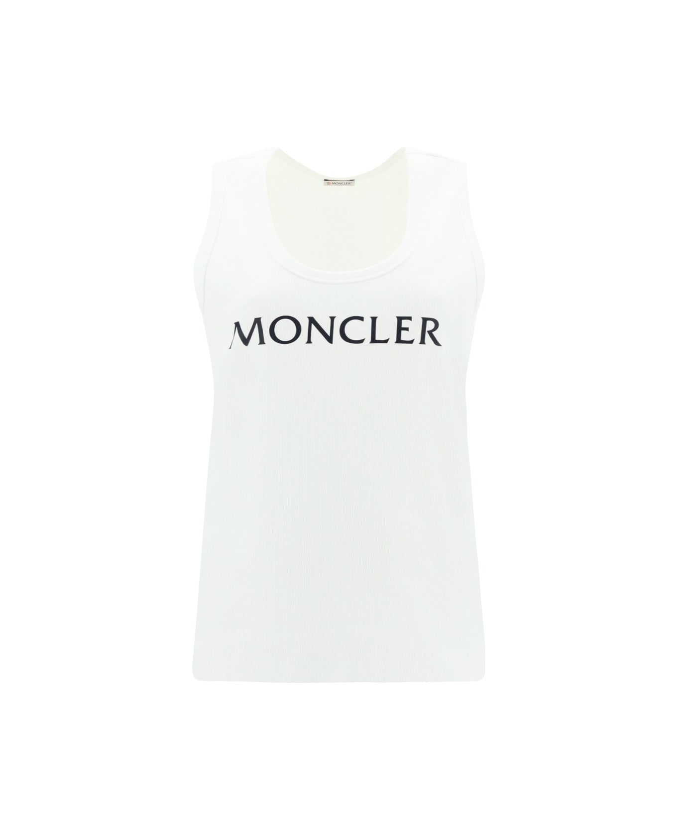 Cotton top by moncler, iconic brand monogram printed in contrasting colour on the front, all-over ribbed design, monochrome pattern, ribbed hem, regular fit.