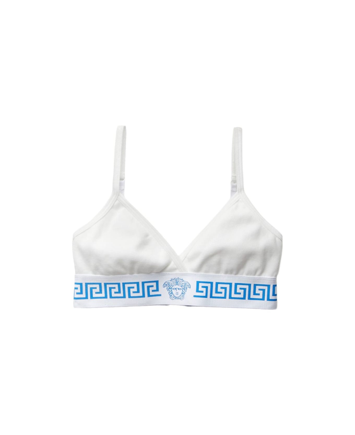 A ribbed-knit stretch cotton triangle bralette featuring an elastic waistband with a jacquard Greca and central Medusa motif. The loungewear style can be worn with matching briefs. Medusa motif Greca motif shoulder straps three-button placket elastic waistband outer composition: 95% cotton, 5% elastane lining: 95% cotton, 5% elastane trim: 91% polyester, 9% elastane