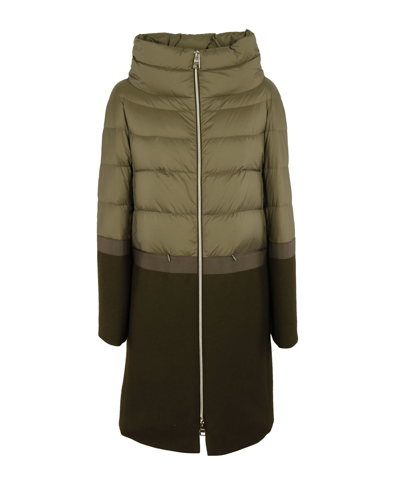 Padded Coat from Herno: Green Padded Coat with funnel neck, front zip fastening, drawstring waist, long sleeves, straight hem and mid thigh length. Composition: 80% Wool, 20% Polyamide
