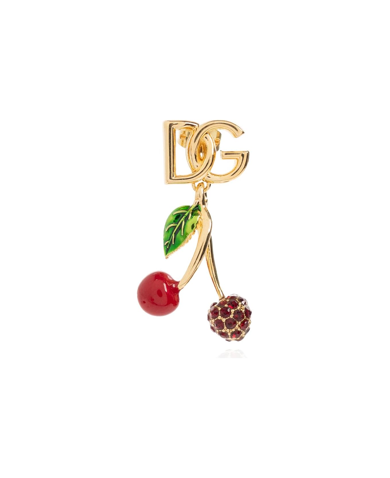 Gold-tone mono earring with the brand's logo from Dolce & Gabbana. Fastened with a push back closure, this item showcases a cherry charm with a colourful enamel trim and glossy crystals. Composition: 90% Copper 5% Glass 5% Enamel