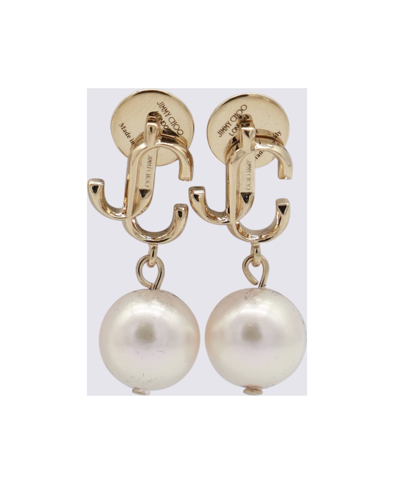 Gold tone brass earrings from Jimmy Choo featuring gold tone, back fastening, pearl and logo. Composition: _, 100% Metallic Fiber