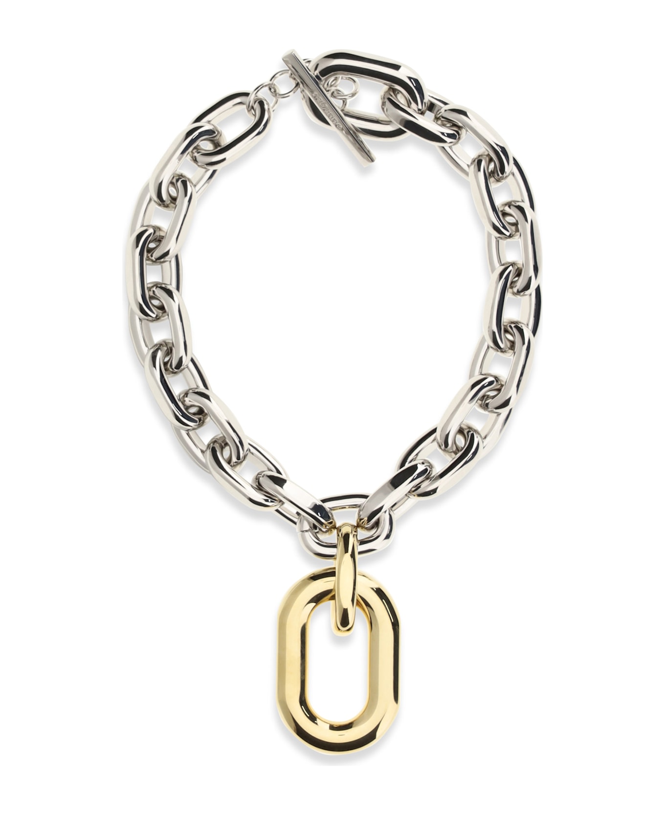 The xl necklace by paco rabanne is a bold and modern accessory, featuring a two-tone gold and silver design. the large interlocking links create a graphic and distinctive effect, while the t-bar clasp ensures security and ease of use. an iconic piece that combines contemporary style and statement jewelry.