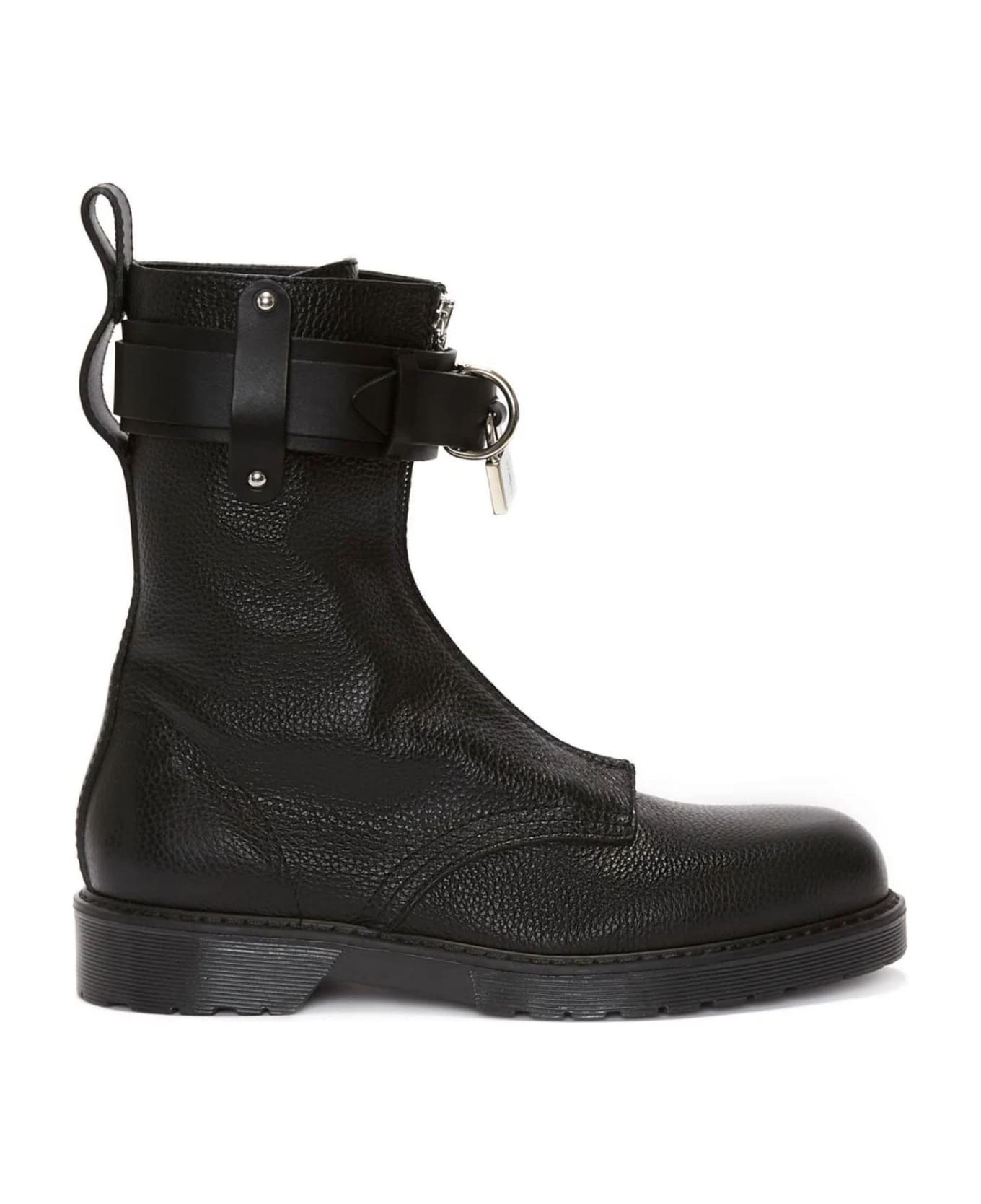 Black padlock combat boots, sheepskin/calf leather, almond toe, padlock detail, front zip fastening, ankle-length, flat sole, rubber sole