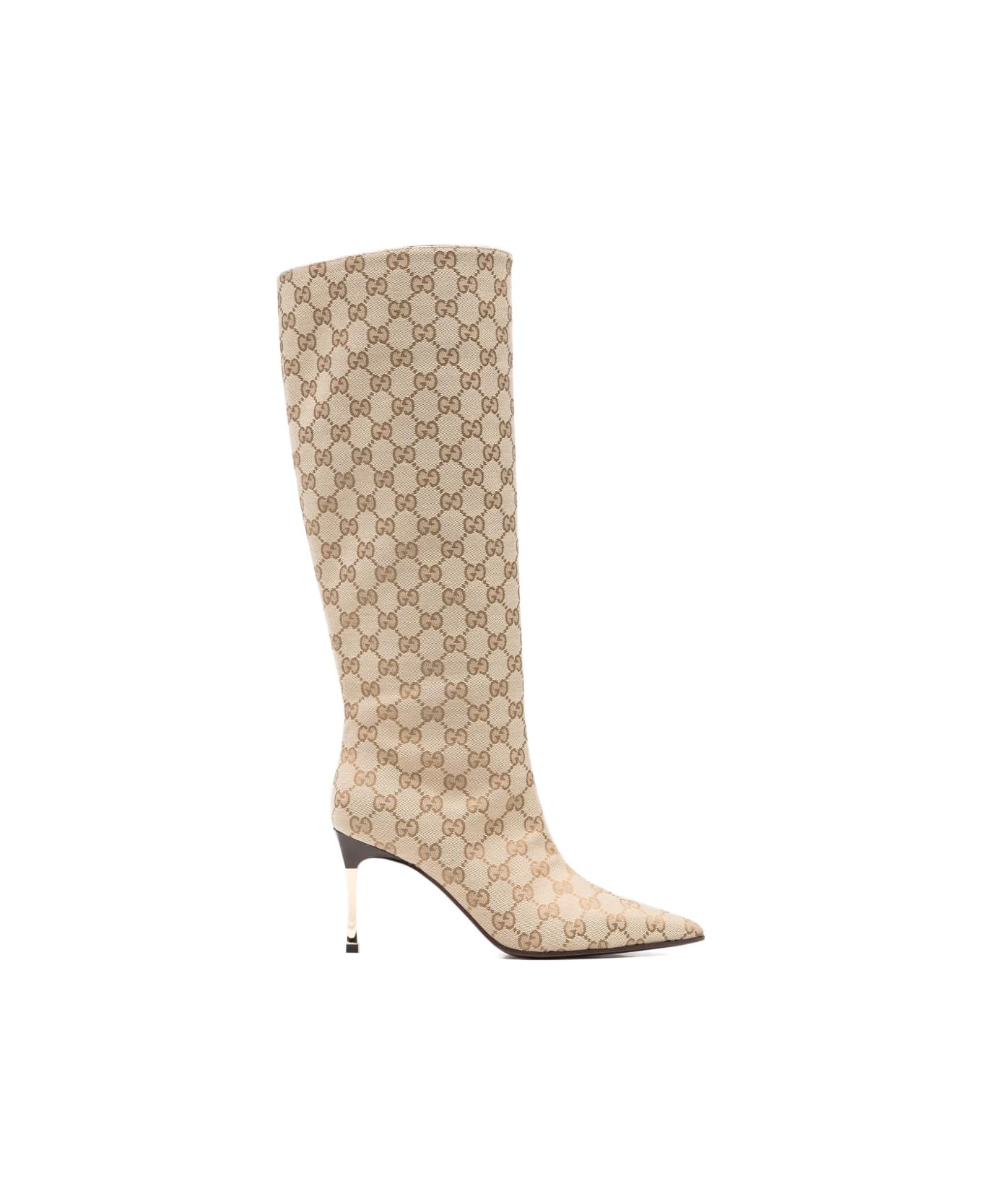 GG fabric in sand and dark brown, beige and dark brown leather lining, pointed toe, steel stiletto heel, dark brown leather sole. Composition: 100% Fabric