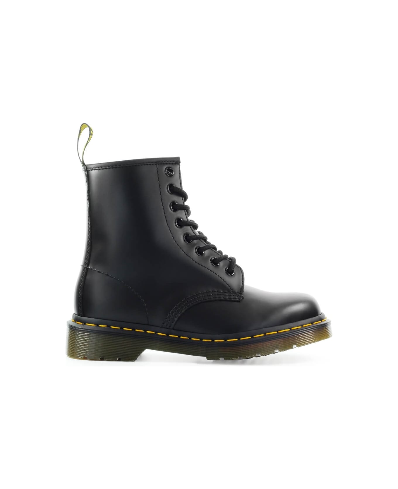 1460 Smooth combat boot by Dr. Martens made of smooth black leather, featuring 8-eye lacing, back tongue and iconic Goodyear welt with yellow stitching. Non-slip rubber sole, height 4 cm.