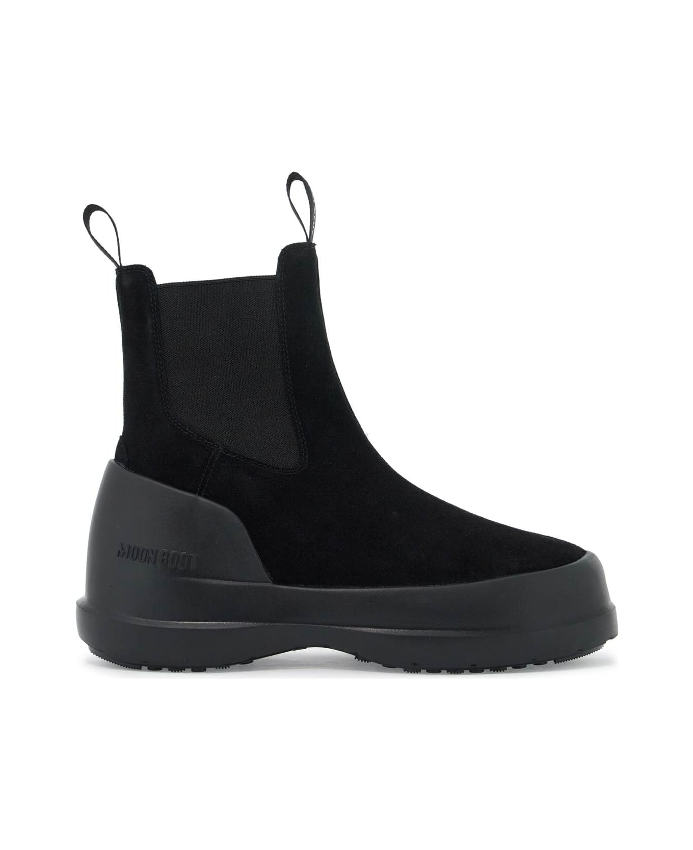 The Luna Chelsea ankle boots by Moon Boot have a minimal design and are made of suede leather with an oversized rubber sole that also covers the heel. They feature elastic inserts on the sides, embossed logo on the back, soft jersey lining, EVA midsole, and non-slip rubber tread. Suitable for both left and right feet.