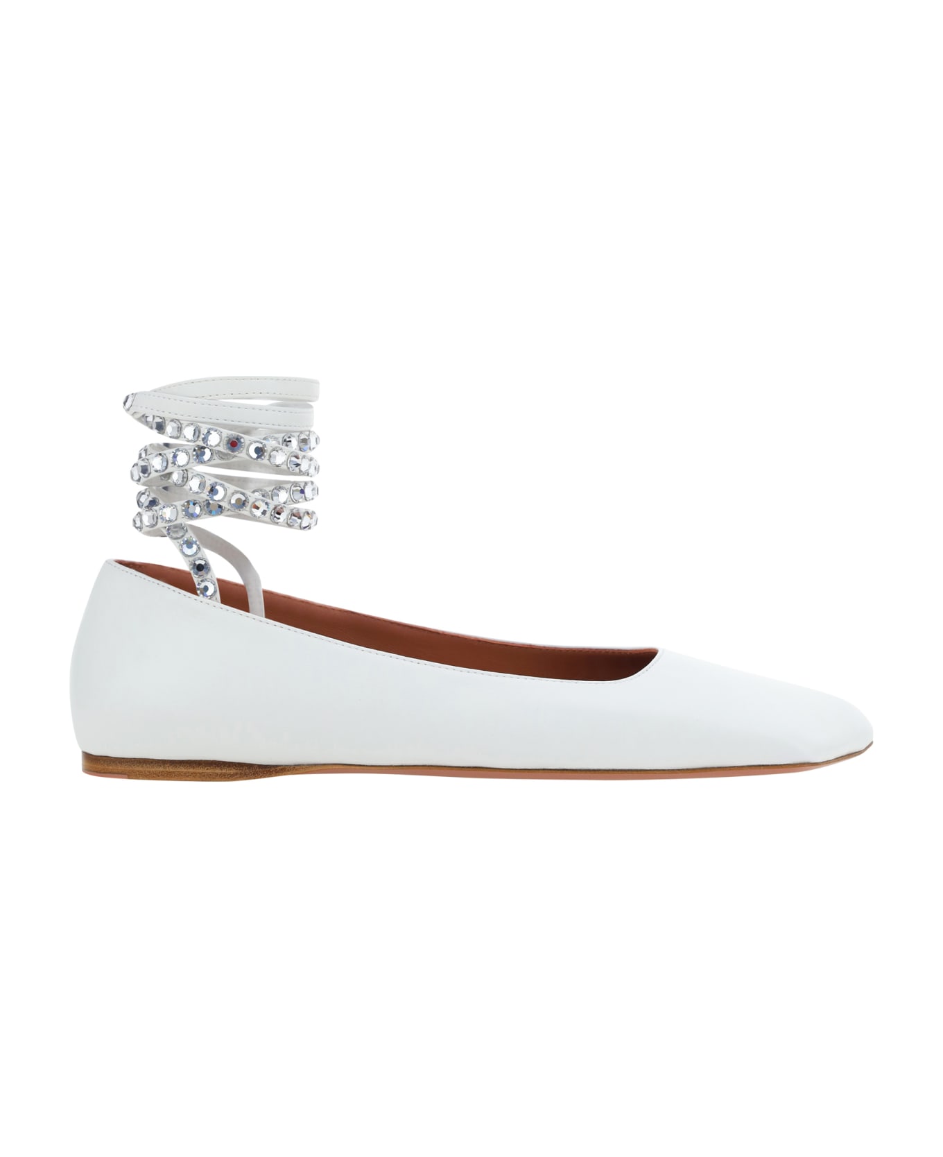 Calfskin ane ballerinas by amina muaddi featuring a flat sole, a square geometric toe, an ankle lap strap closure embellished with contrasting appliqué shiny jewels, a self-tie strap at the back, and a logo-embossed insole. Composition: 100% % Calf Leather Bos Taurus