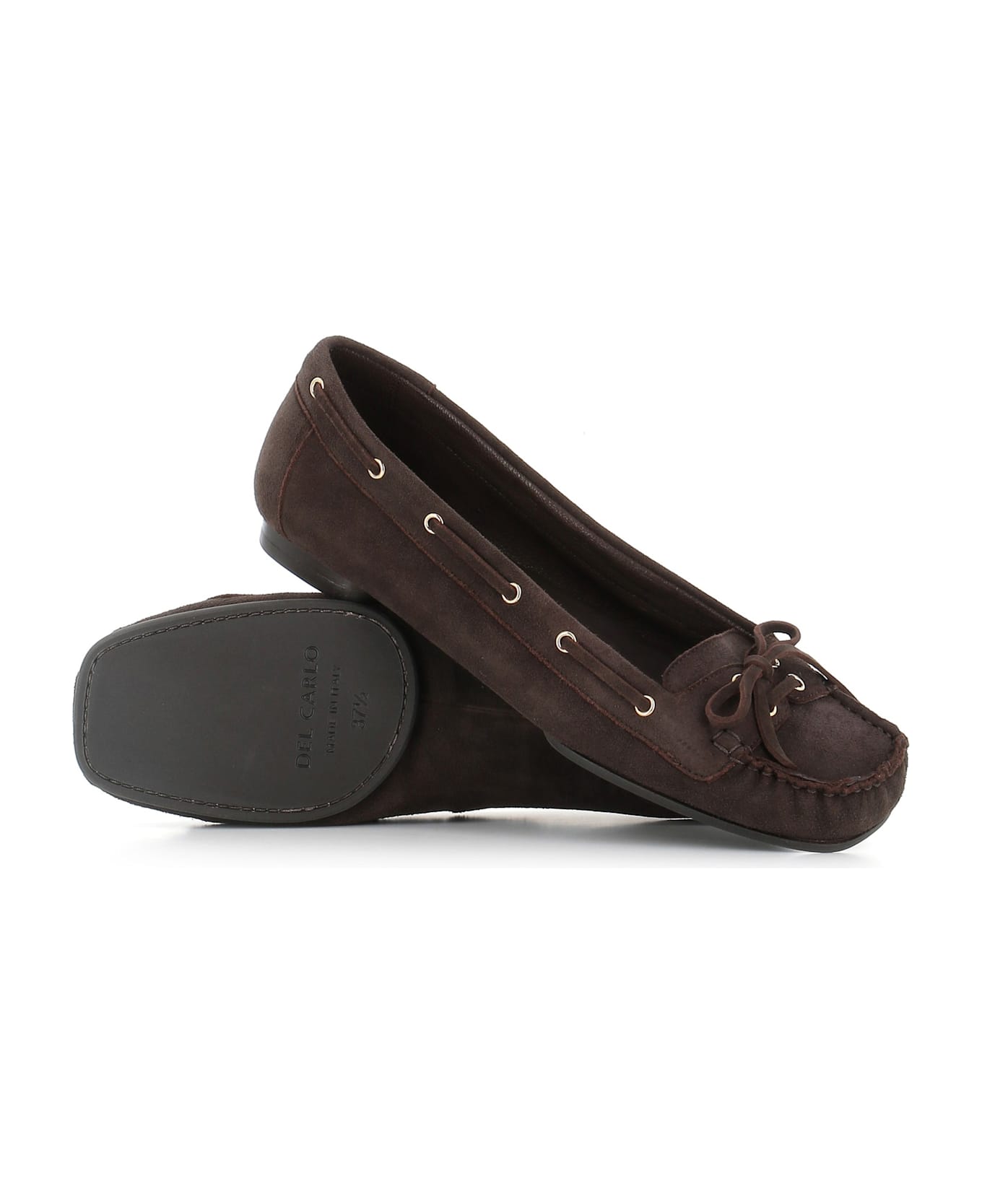 Dark brown suede women's loafer by Del Carlo, featuring by a square toe. Rubber sole. Lined interior. Heel: 1 cm