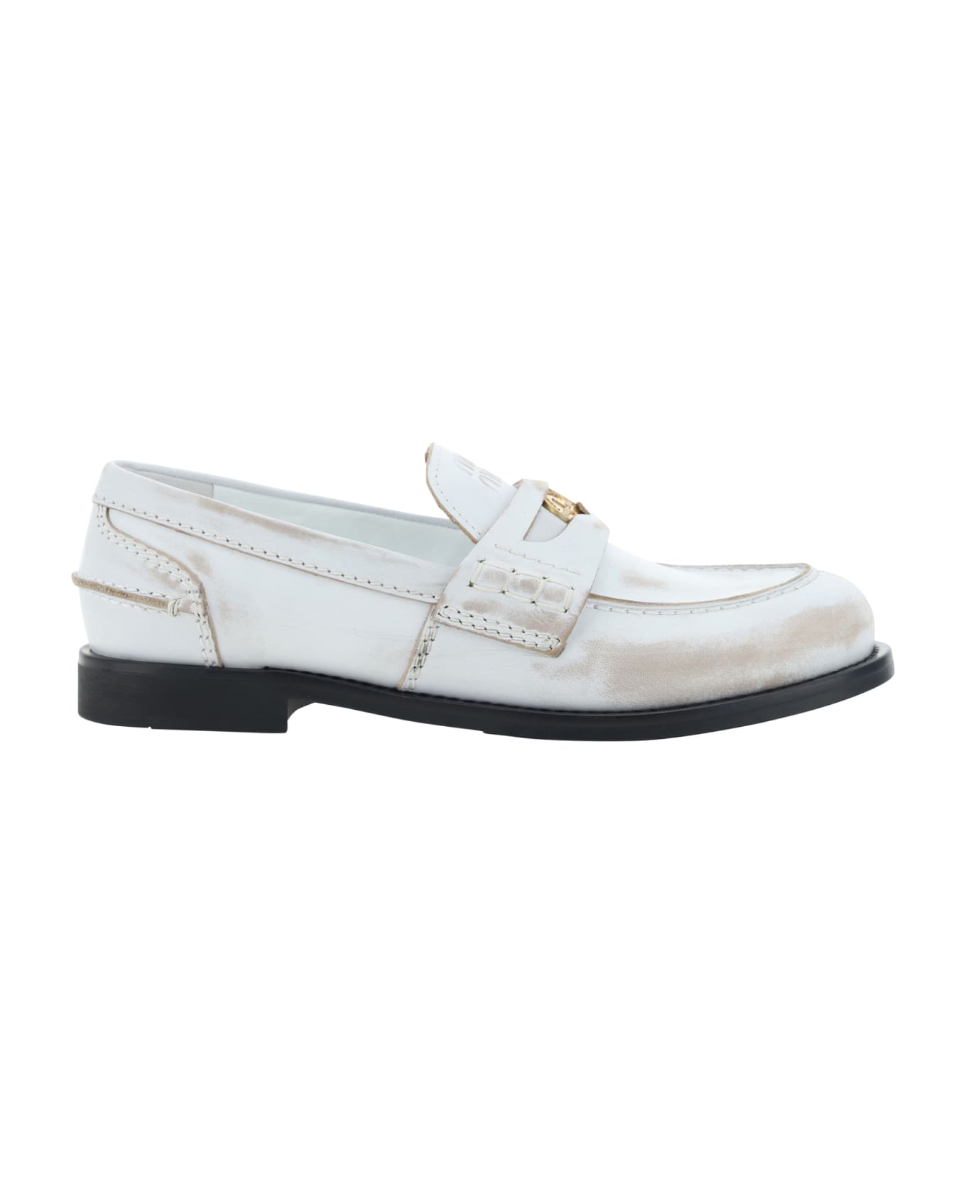 Calfskin loafers by miu miu, block heel, elongated toe, leather front tray with iconic brand logo embossed applique, brand signature press-stamped on front, contrasting logo insole. Composition: 100% % Calf Leather Bos Taurus, 100% % Rubber