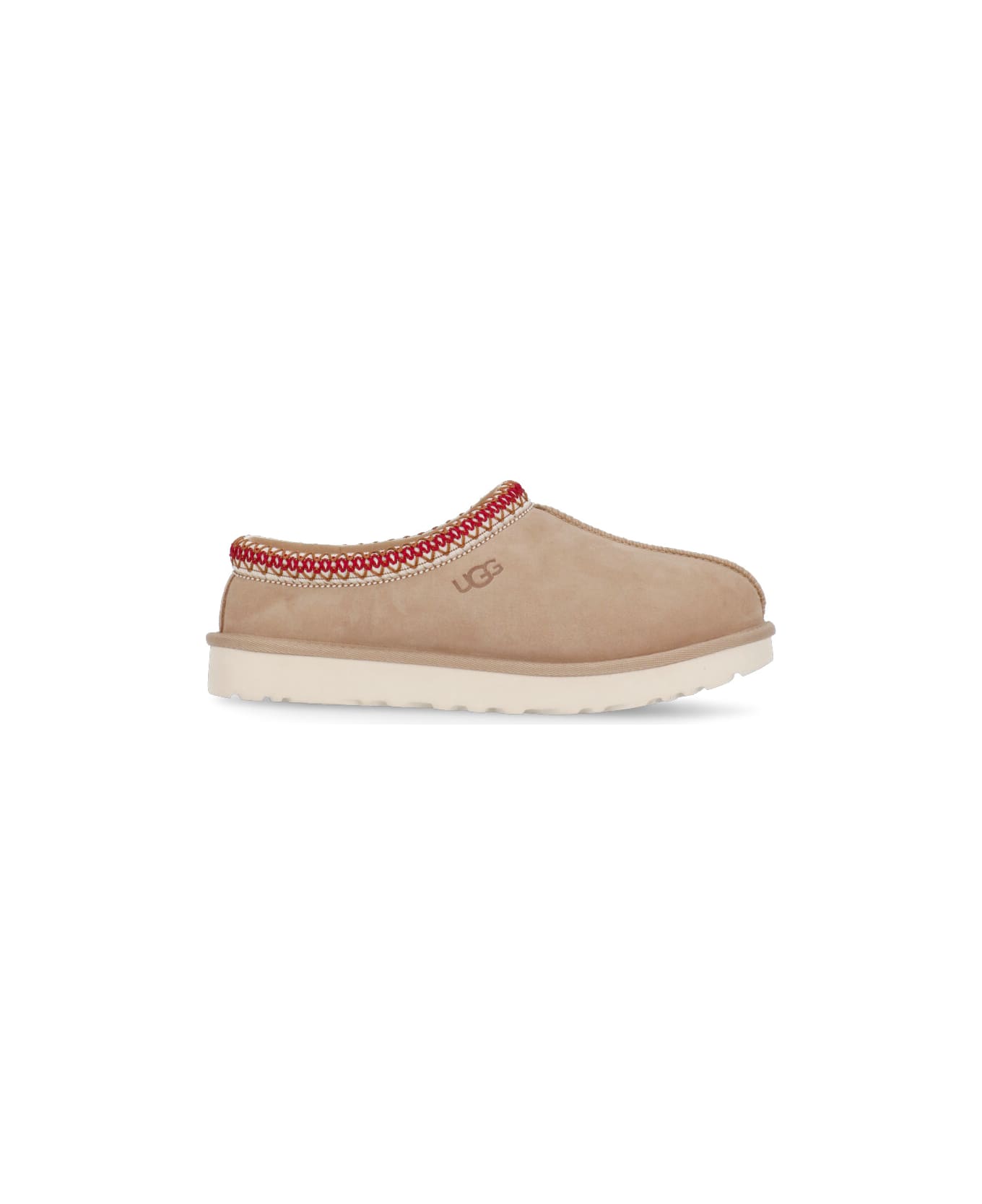 - Beige Ugg suede leather slippers for woman - Round toe - Side tone on tone embossed logo - Sheep fleece interior - Trim with contrasting color geometric embroidery - Rubber sole