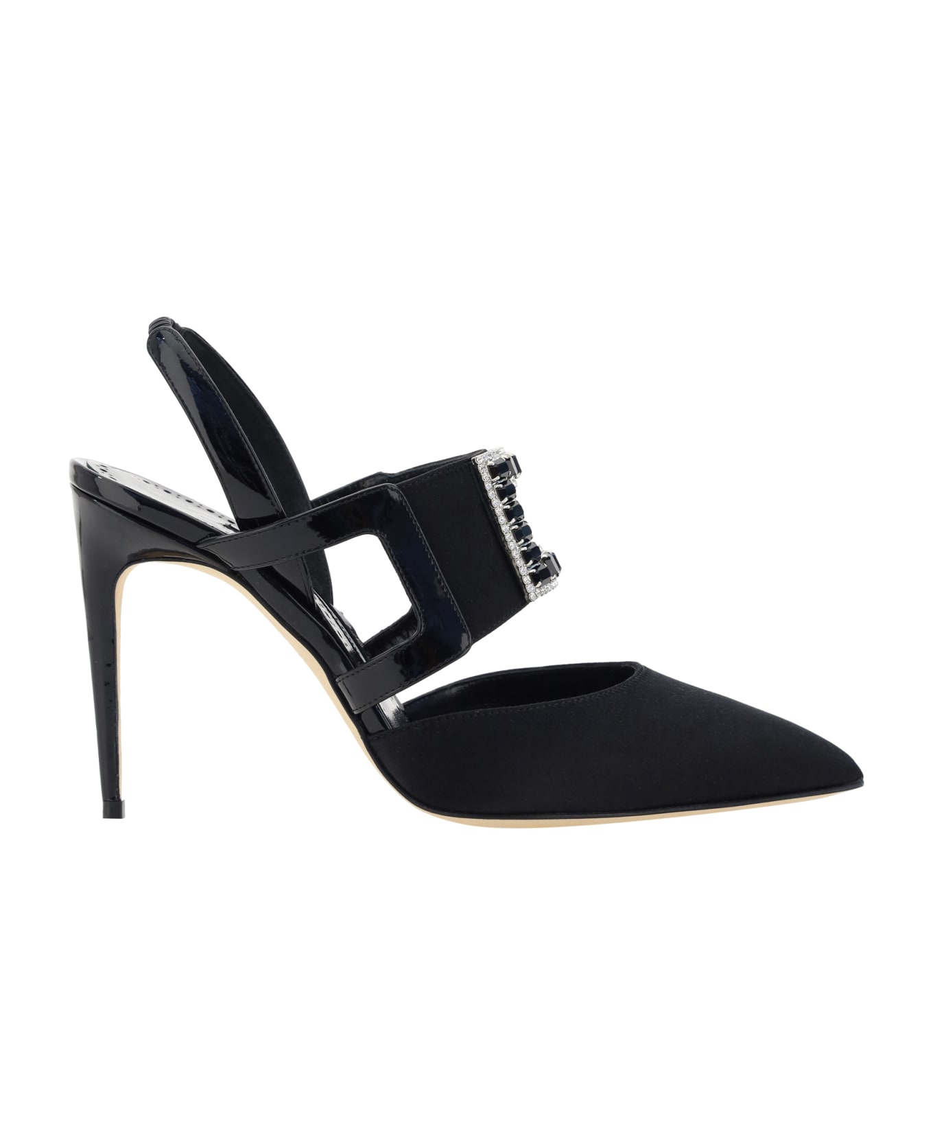 Bimixpla micro pumps by manolo blahnik featuring an elongated toe, a stiletto heel, a shiny leather design, an elasticized slingback detail on the back, and a band with jewel detail on the front. Composition: 30% % Calf Leather Bos Taurus, 100% % Calf Leather Bos Taurus, 70% % Silk Satin