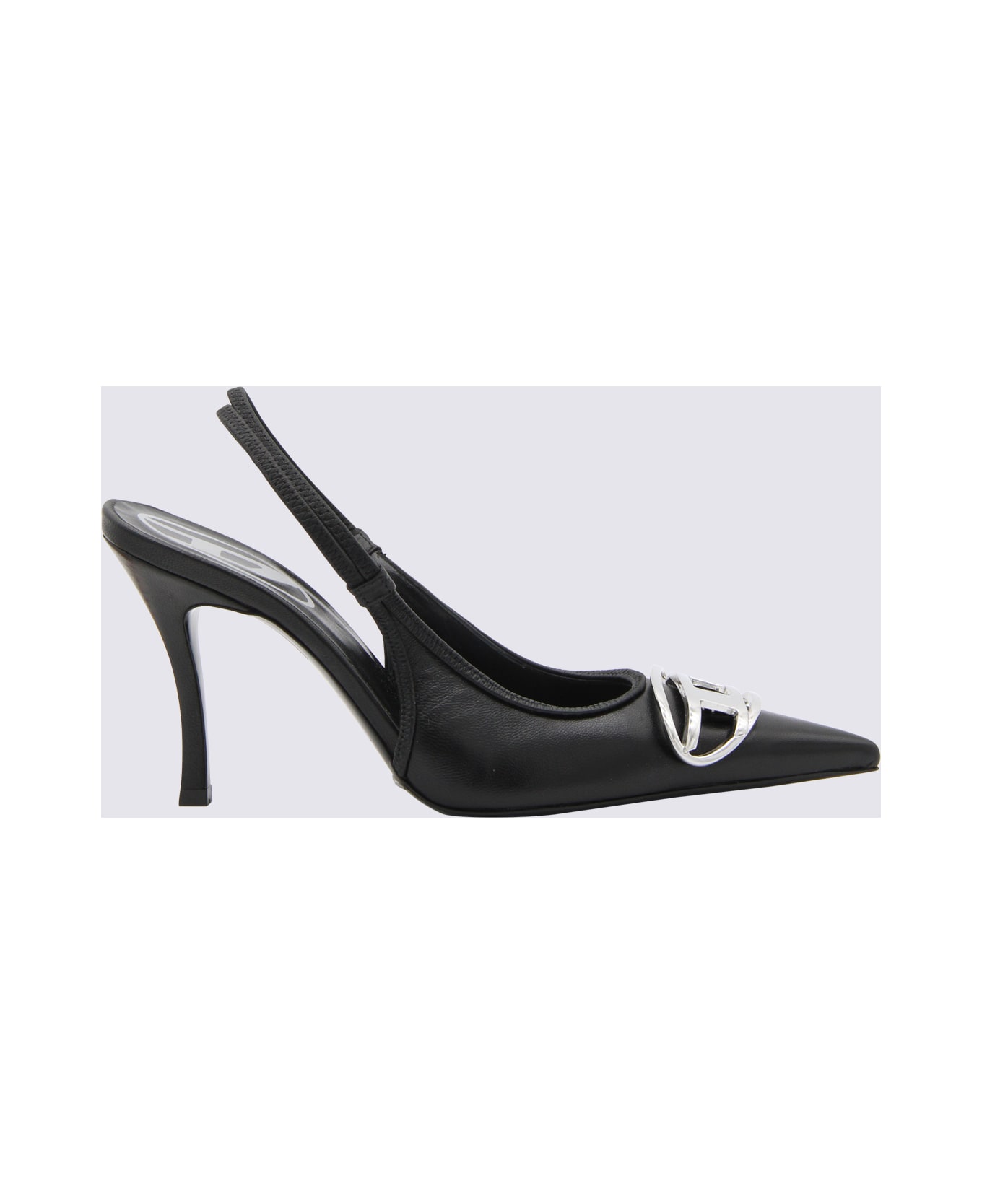 Black leather pumps from Diesel featuring pointed toe, elasticated slingback strap, mid stiletto heel, logo embellishment, branded insole and silver-tone hardware. Composition: _cover, 100% Le Sole, 100% Elastodiene